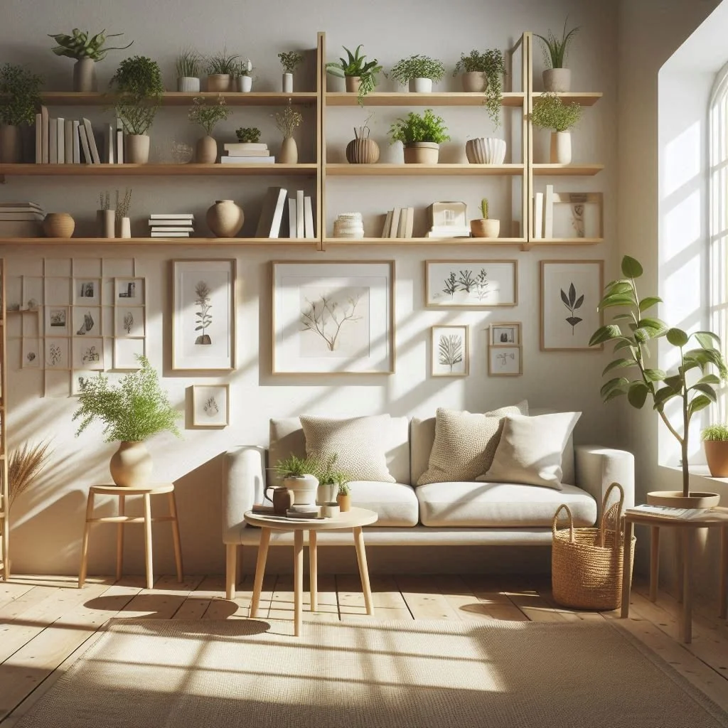 Incorporate open shelving to display books, plants, and decor items. Floating shelves or built-in units with a minimalist design provide storage without feeling bulky, maintaining the room's airy atmosphere. Choose shelves with clean lines and neutral colors to blend seamlessly with the rest of the decor. Keep the displays simple and uncluttered by arranging items thoughtfully, leaving some negative space to avoid a crowded look. Display a curated selection of books, a few well-chosen plants, and minimal decor pieces to add personality without overwhelming the space. This approach enhances functionality while preserving the minimalist vibe, creating a balanced and inviting environment.