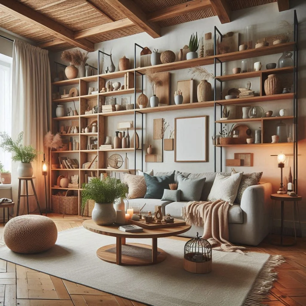 Open shelving offers a perfect blend of practicality and style, allowing you to showcase your personality while enhancing the functionality of your living room. Install wooden shelves on a blank wall to serve as both storage and a decorative feature. To create a cohesive, rustic aesthetic, adorn the shelves with thoughtfully chosen accents such as ceramic vases, woven baskets, and vintage books. These elements add texture and charm, reflecting your personal taste while complementing the room's overall design. Be mindful of balance and keep the display curated to avoid visual clutter, ensuring the shelves maintain an organized and polished look. Open shelving not only provides a space for your favorite decor pieces but also contributes to the room's warmth and character, making it a standout feature in any modern rustic living room.