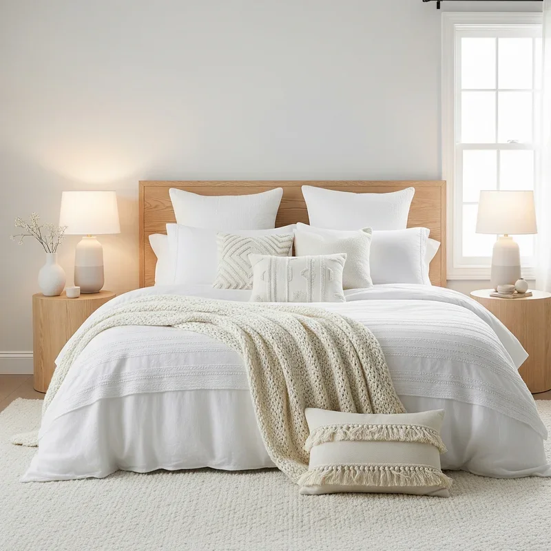 Transform your bedroom into a cloud-like sanctuary by mastering the art of layering different white textures that create depth without color. Think of it as a symphony in white! Mix crisp cotton sheets with a chunky waffle-weave blanket, add a faux fur throw, and top with linen pillows in varying shades of ivory and cream. The key is combining matte and shiny, smooth and rough, heavy and light textures that catch light differently throughout the day. Include a white shag rug beside your bed and white curtains in a different fabric weight than your bedding. This monochromatic approach isn't flat or boring; it's sophisticated and calming, creating visual interest through tactile variety. Your all-white bedroom becomes a serene retreat that feels luxurious and intentional, proving that sometimes the most powerful design statement is elegant restraint.