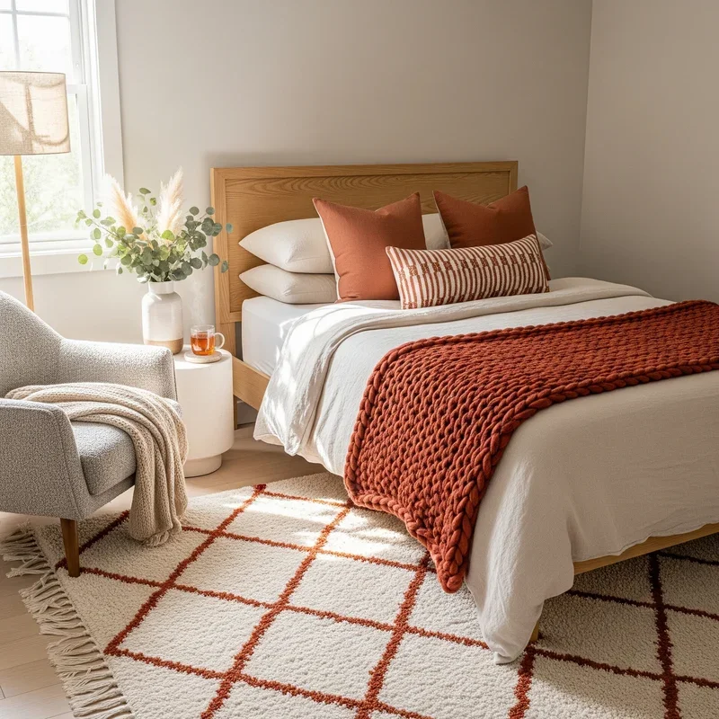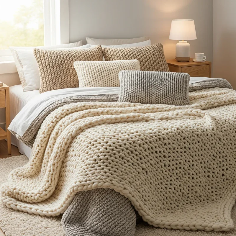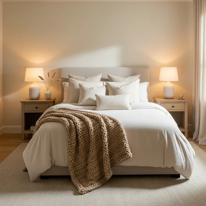 Add instant coziness with oversized chunky knit elements that make your neutral bedroom feel like a warm embrace. Texture goals achieved! These statement pieces in cream, grey, or camel add visual weight and tactile appeal that draws you in. Drape a massive knit throw across the foot of your bed or over a reading chair. Mix different knit patterns: cable knit, seed stitch, and simple garter for variety. The three-dimensional quality of chunky knits creates shadows and highlights that change with lighting. Include knit poufs as alternative seating that doubles as footrests. These soft elements balance harder surfaces like wood or metal in your room. Your chunky knit additions become the comfort factors that make your bedroom irresistibly inviting, especially during colder months.