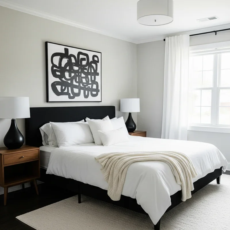 Master the ultimate neutral combination with strategic black and white elements that create drama without color. Classic never goes out of style! Use black as an accent through picture frames, lamp bases, or a statement chair. Keep walls white but add black through artwork or a geometric rug. The high contrast creates visual interest and defines spaces within your bedroom. Include patterns like stripes, checks, or abstract prints that play with these two tones. Grey elements can bridge the contrast when needed. The key is balance: too much black feels heavy, too much white feels sterile. Your black and white bedroom becomes a timeless space that feels both graphic and sophisticated.