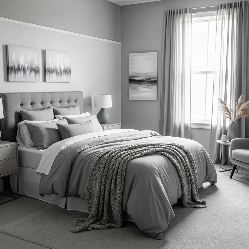 Create a sophisticated retreat using various shades of grey that prove this color is anything but dull. Fifty shades of chic! Layer greys from palest dove to deepest charcoal, creating a gradient that adds depth and interest. Choose bedding in medium grey with lighter and darker accent pillows. Paint walls in warm greige (grey-beige) to avoid coldness. The key is mixing warm and cool greys to create balance and prevent the space from feeling flat. Add different textures within the grey palette: smooth cotton, rough linen, and plush velvet. Include pattern through grey geometric prints or subtle stripes. Your grey sanctuary becomes a sophisticated space that feels both modern and timeless, proving grey is the ultimate neutral.