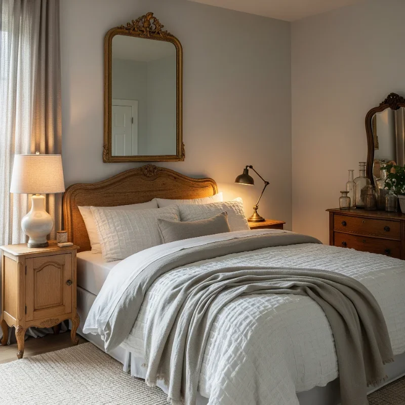 Blend old-world charm with neutral colors by incorporating vintage and antique pieces that add character without overwhelming color. History meets serenity! Hunt for antique furniture in natural wood tones or painted in soft whites and creams. Add vintage mirrors with aged patina, antique brass hardware, and weathered picture frames. Mix these older pieces with modern neutral bedding and contemporary lighting. The contrast between old and new creates visual interest while maintaining color cohesion. Include vintage textiles like grain sacks or antique linen for authentic touches. Your vintage-neutral bedroom becomes a curated space that tells a story while maintaining calm sophistication.
