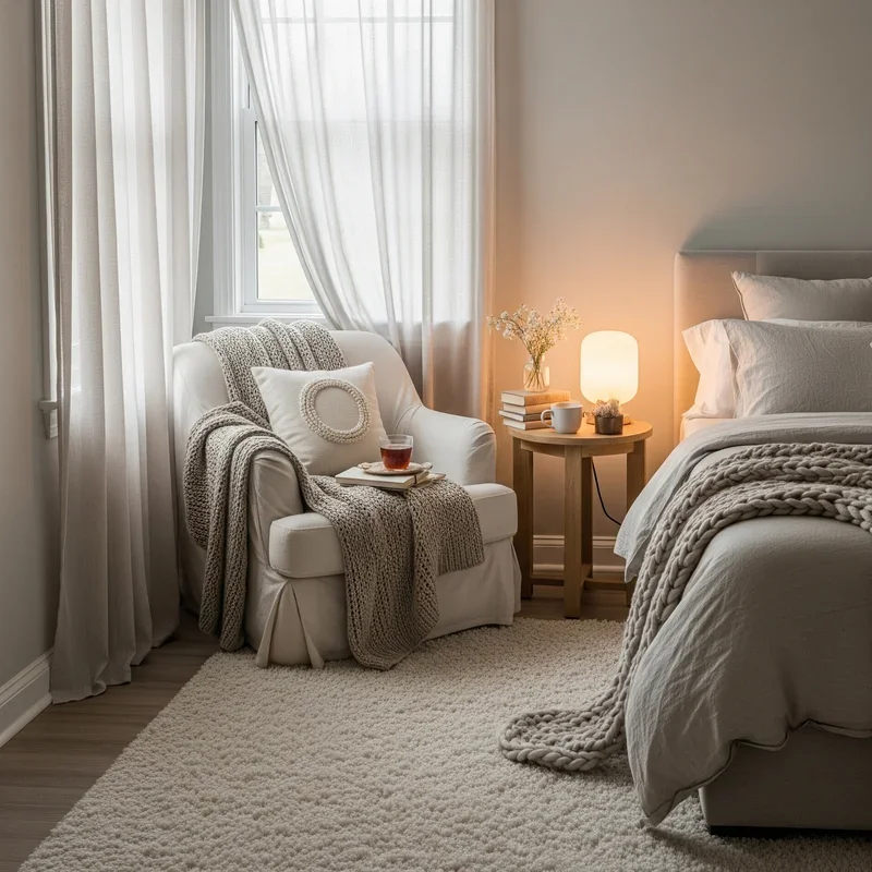 Carve out a special corner for reading by creating a neutral nook that invites hours of comfortable page-turning. Bookworm paradise achieved! Position a comfortable chair in natural linen or soft leather near a window. Add a chunky knit throw and several pillows in varying neutral tones. Include a small side table in natural wood for your coffee and current reads. Layer a small rug to define the space and add warmth underfoot. Install floating shelves to display books with neutral-colored spines. The contained area within your bedroom becomes a retreat within a retreat. Your reading nook becomes the perfect spot for morning coffee or evening unwinding, proving that functional spaces can be beautifully neutral.