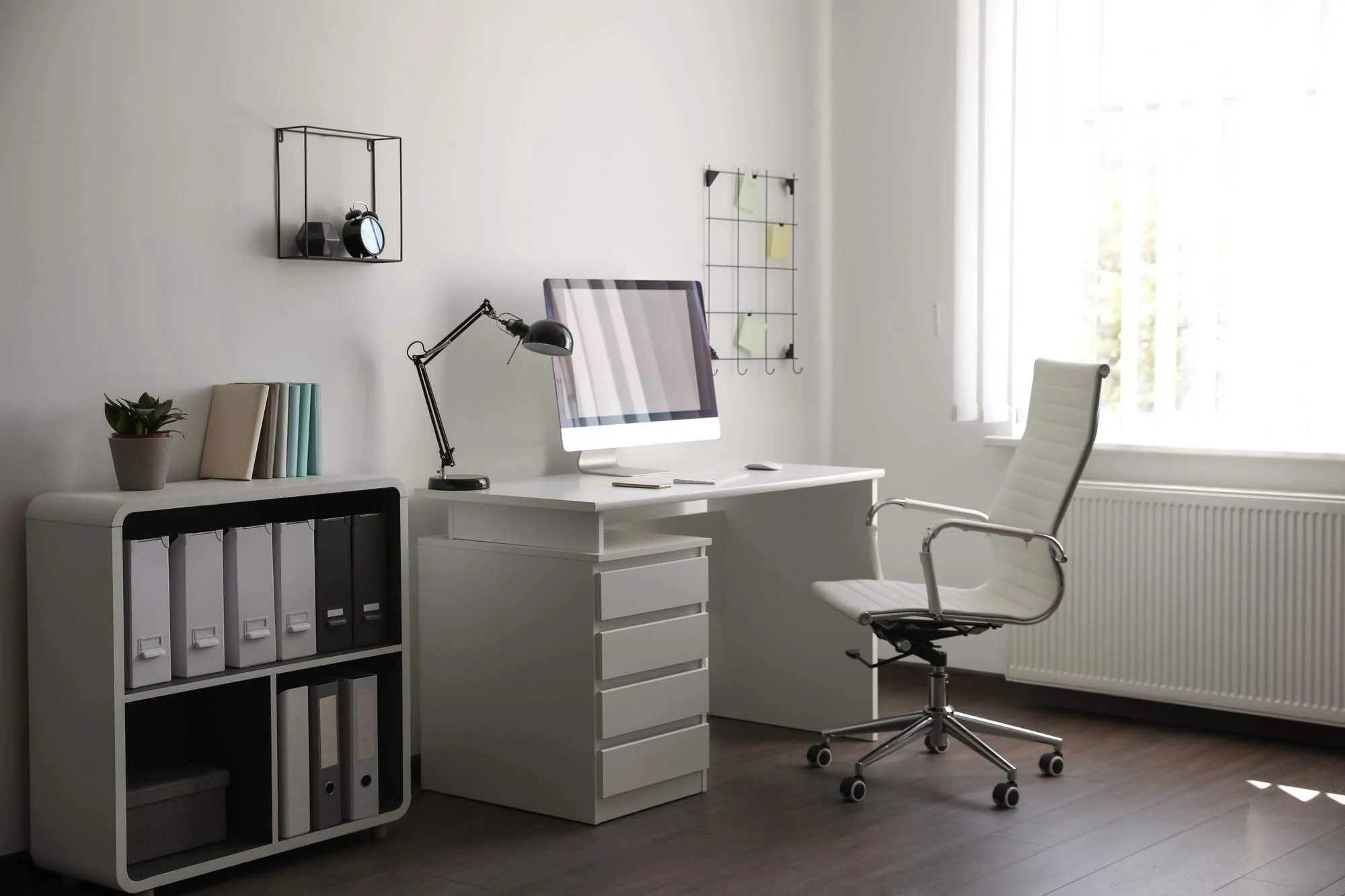 A minimalistic office set-up allows you to achieve a clean, clutter-free workspace. This can be achieved by investing in simple functional furniture. Incorporating multifunctional furniture, like an office desk with additional storage, allows you to maximise any available space. Other minimalist home office decor ideas include monochrome colour palettes, strategic lighting, and ensuring you have ample natural light. You can also personalise your workspace with some decor or art pieces.