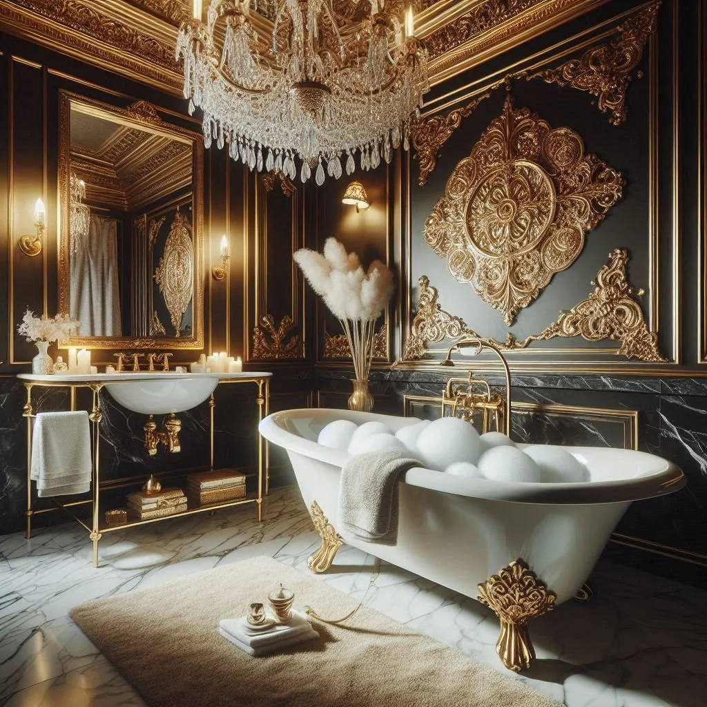 Combine dark colors with gold accents to achieve a luxurious, opulent feel in your space. Gold fixtures, mirrors, and accessories stand out beautifully against dark backgrounds, creating a rich and elegant look. The contrast between the deep hues and shimmering gold elements adds depth and sophistication, making the room feel both warm and glamorous. Whether it's a dark-painted wall, a black vanity, or deep-toned cabinetry, the addition of gold hardware and decor can elevate the entire aesthetic. This combination not only enhances the visual appeal but also exudes a sense of timeless luxury and refinement, perfect for creating an inviting and stylish environment.