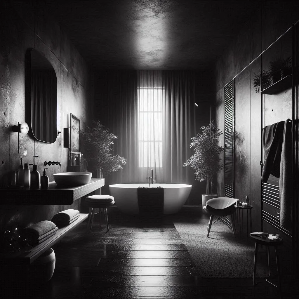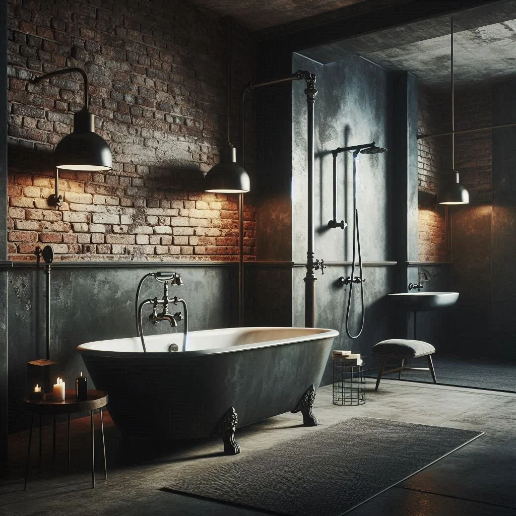 Embrace an industrial chic look in your bathroom by incorporating dark colors and raw materials. Use black or dark grey walls as a dramatic backdrop, and highlight the space with exposed pipes for an authentic industrial feel. Integrate concrete or metal accents, such as a concrete sink, metal shelving, or a steel-framed mirror, to enhance the edgy aesthetic. These elements combine to create a stylish, modern bathroom that exudes urban sophistication. The interplay of dark tones and raw textures adds depth and character, transforming the bathroom into a unique and visually intriguing space. This design approach balances functionality with a bold, contemporary vibe, perfect for those who appreciate a rugged yet polished look.