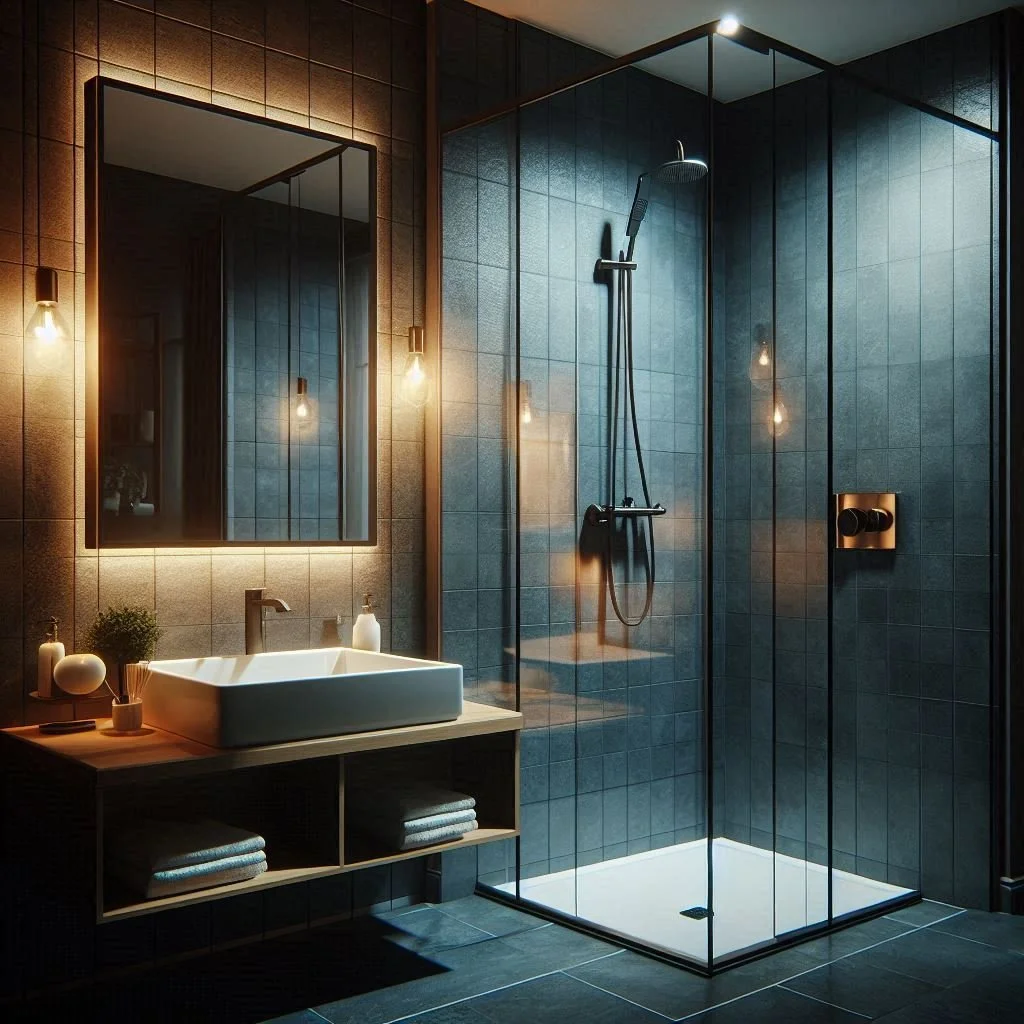 A dark shower enclosure can create a bold, sophisticated look in your bathroom. Use black or dark grey tiles paired with black fixtures to establish a sleek and modern aesthetic. Adding a glass door enhances the design by providing a clear view of the striking tile work and creating an open, airy feel despite the dark colors. This combination exudes contemporary elegance and transforms the shower into a stylish focal point of the bathroom. The contrast between the dark elements and the transparency of the glass door adds depth and visual intrigue, resulting in a chic and inviting shower space that is both functional and luxurious.
