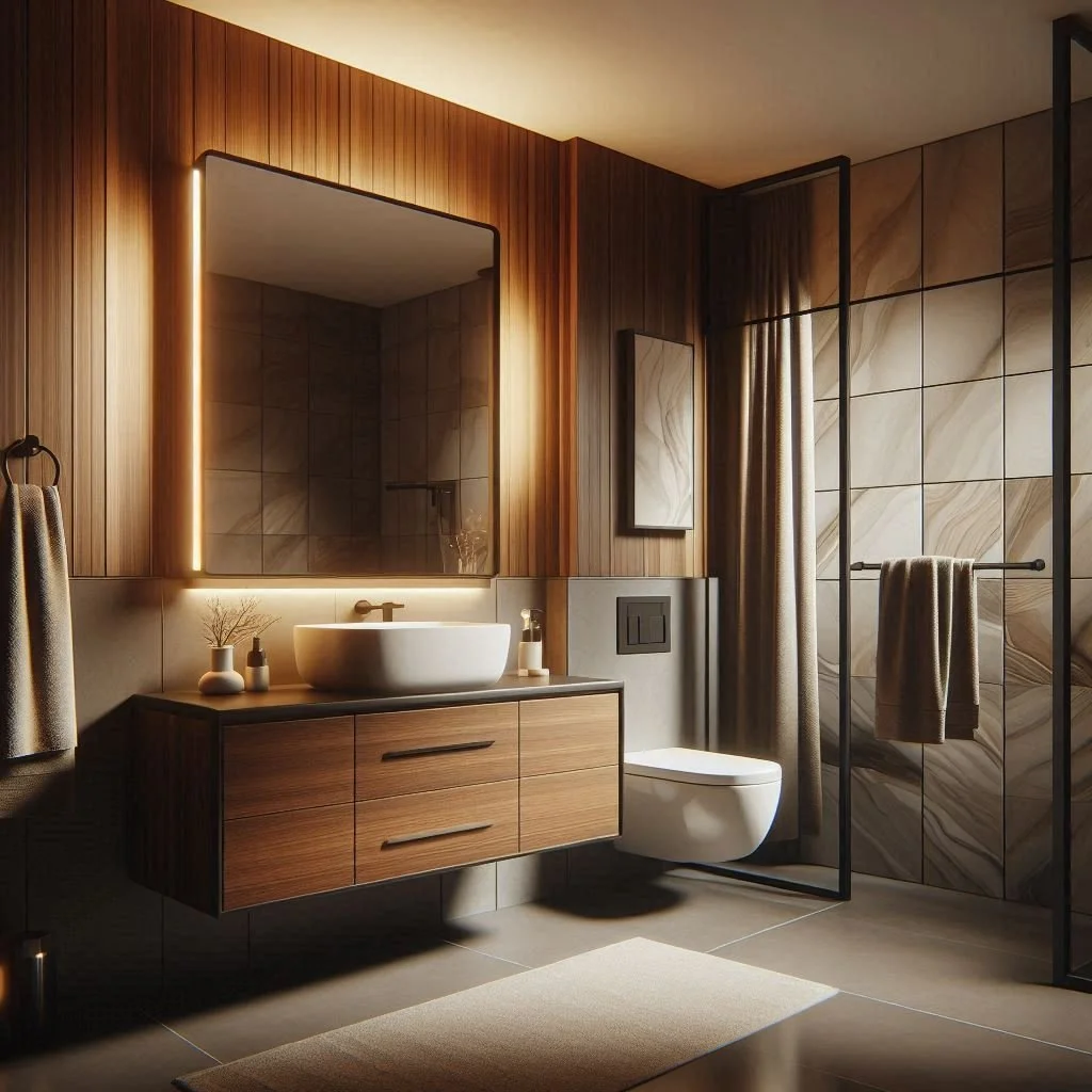 Incorporate dark wood accents to add warmth and texture to your bathroom, creating a cozy yet sophisticated atmosphere. A dark wood vanity can serve as a stunning centerpiece, providing both functionality and style. Complement this with dark wood shelving or wooden wall panels to enhance the natural, earthy vibe. The rich tones and natural grain of the wood introduce an inviting warmth that balances the sleekness of other modern elements. By integrating dark wood accents, you achieve a harmonious blend of comfort and elegance, transforming your bathroom into a serene and stylish retreat.