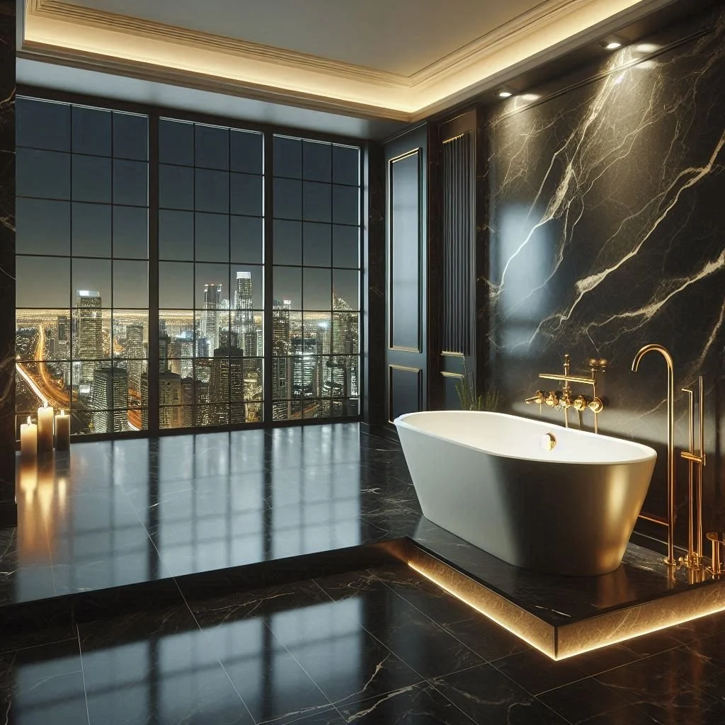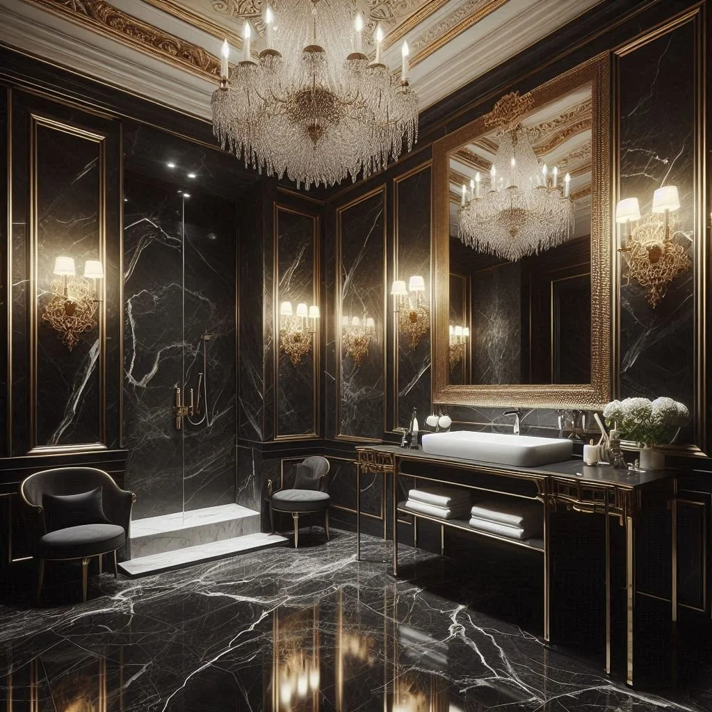 Incorporate dark marble for an instant touch of luxury in your kitchen or bathroom. Whether used for countertops, flooring, or wall tiles, dark marble with white veining adds elegance and depth to the space. The striking contrast of dark stone and light veining creates a sophisticated and timeless aesthetic. Pairing dark marble with gold or brass fixtures enhances the opulence, providing a rich, glamorous look that exudes refinement. This combination not only elevates the overall design but also ensures a stunning focal point that captures attention and admiration. By integrating dark marble, you achieve a luxurious and elegant ambiance that transforms your space into a true masterpiece.