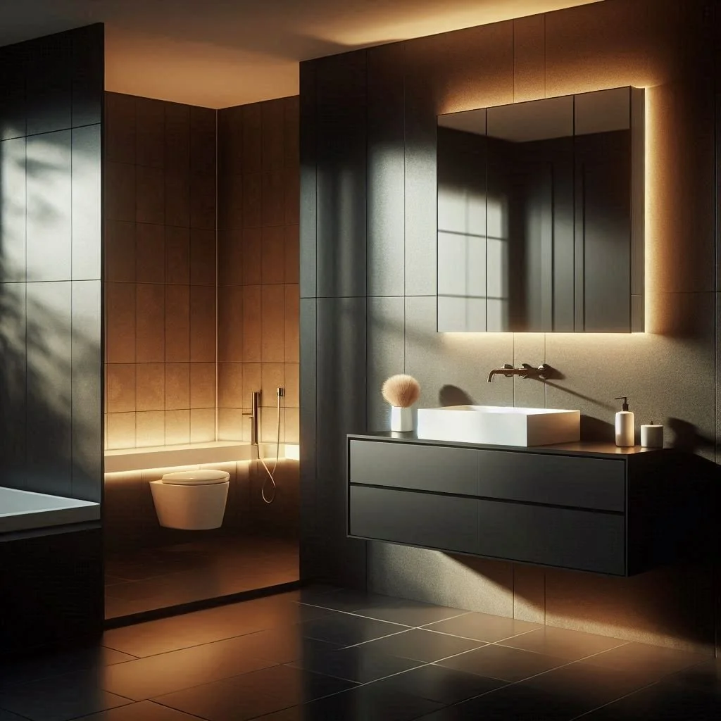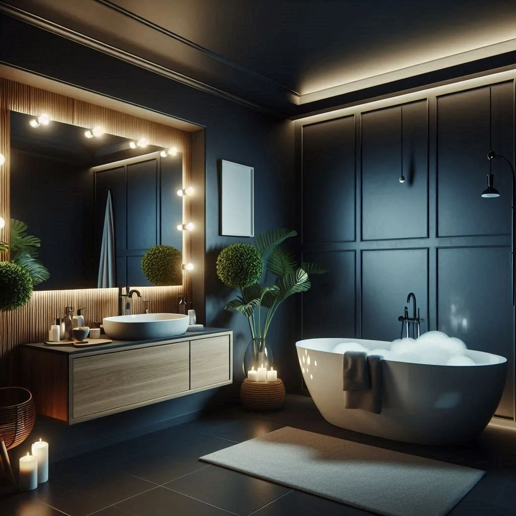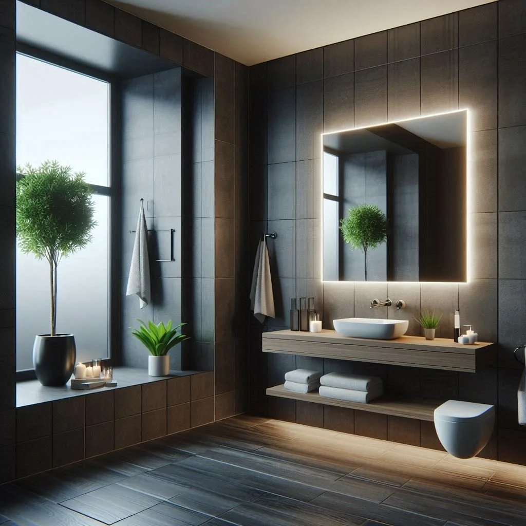 Lighting plays a crucial role in setting the mood in a dark bathroom, enhancing its luxurious feel. Use dimmable lights to adjust the ambiance according to your needs, from bright and functional to soft and relaxing. Backlit mirrors provide a gentle, even glow that adds a touch of elegance and ensures perfect illumination for daily routines. Pendant lights can serve as stylish focal points, casting a warm and inviting light that complements the dark decor. By strategically incorporating these lighting elements, you create a sophisticated and cozy atmosphere, transforming your bathroom into a serene and opulent retreat.
