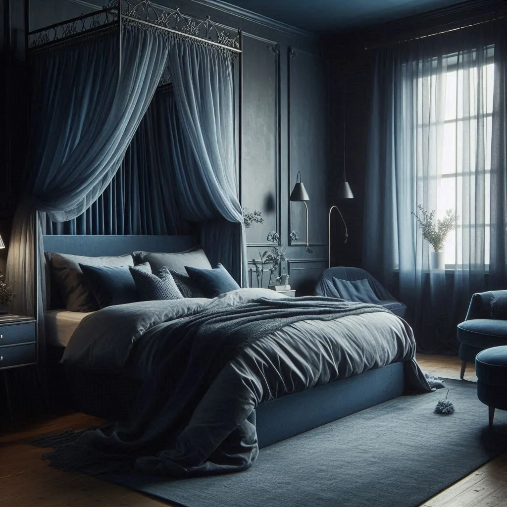 A dark blue canopy bed brings boldness and luxury to any bedroom, making a striking statement. The canopy adds height and drama, while the deep blue color creates a cozy, intimate atmosphere. To balance the dark tones, pair the bed with light-colored bedding for a refreshing contrast, or embrace a monochromatic look with dark blue sheets and pillows for an all-in, opulent effect. This combination offers a grand, royal feel, transforming the bedroom into an elegant retreat. The rich hue and canopy design elevate the room’s overall aesthetic, making it perfect for those who want to create a stylish, luxurious space that feels both sophisticated and inviting. It’s an ideal choice for anyone looking to add grandeur and comfort to their bedroom.