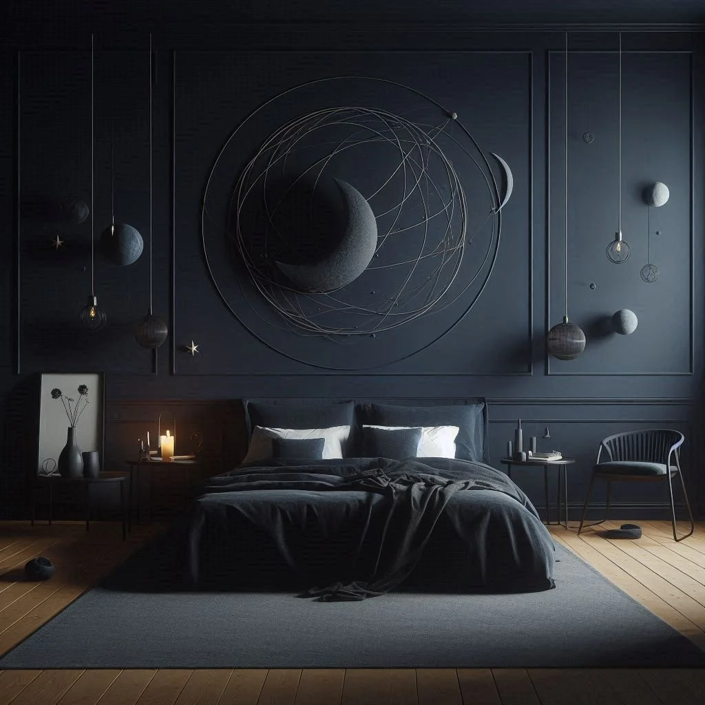 Lighting plays a pivotal role in setting the mood in a dark blue bedroom. Soft, warm lighting against rich, midnight blue walls creates a cozy, inviting ambiance, perfect for unwinding after a long day. Consider incorporating dimmable lamps, wall sconces, or even fairy lights to introduce a gentle glow that complements the deep blue tones without overpowering the room. These lighting choices allow you to adjust the brightness according to the mood, enhancing the depth and richness of the color while maintaining a relaxing atmosphere. The result is a serene, tranquil environment that promotes relaxation, making your bedroom a peaceful retreat where you can comfortably recharge. This thoughtful blend of lighting and color adds both warmth and sophistication to the space.