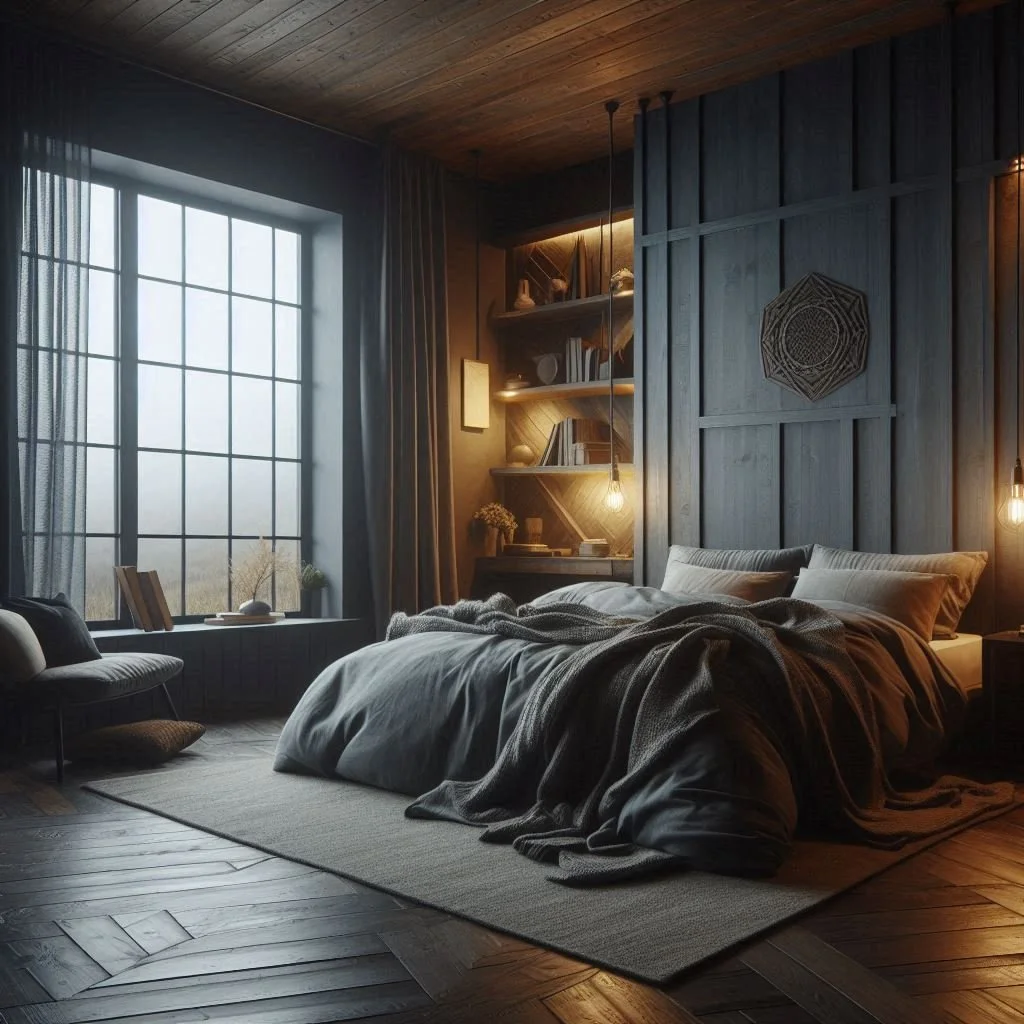Deep blues, rich greens, moody grays, and charcoal are great choices for creating a dark cozy bedroom. These colors add depth and warmth, making the space feel inviting and serene.