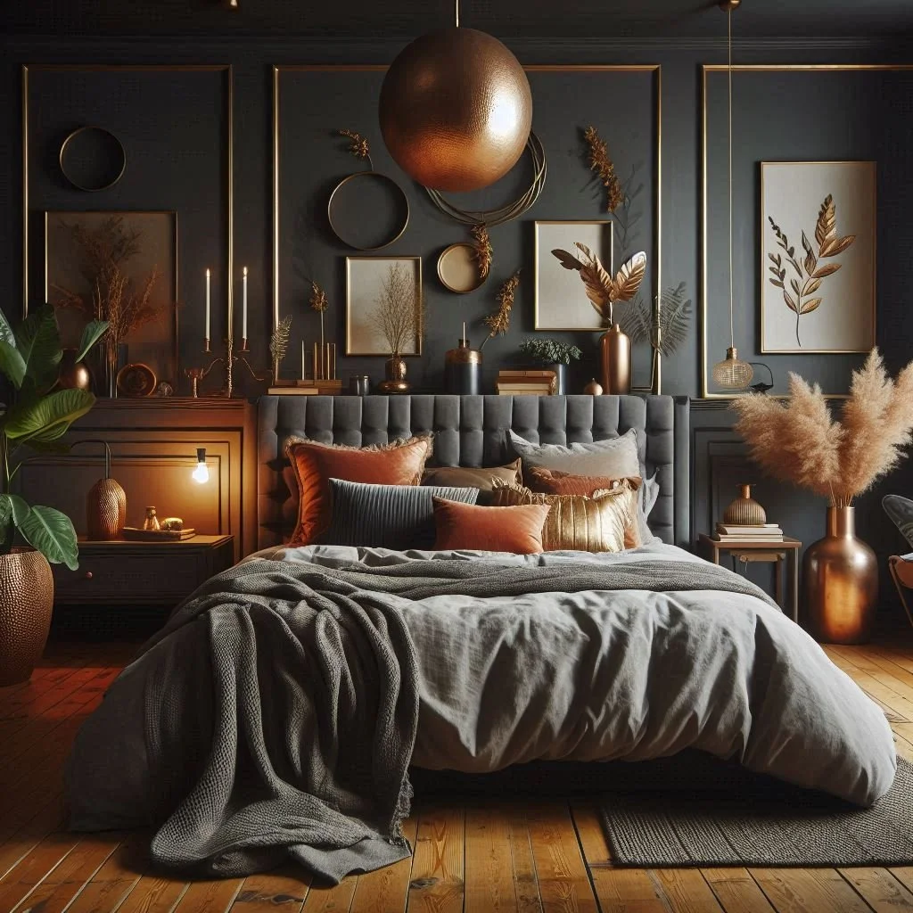 Metallic accents can elevate a dark cozy bedroom by adding a touch of glamour and warmth to the space. Incorporate brass and gold decor items such as candle holders, picture frames, and decorative mirrors to introduce a subtle shimmer and luxurious feel. Mirrored surfaces, whether on furniture like a dresser or nightstand, or decor pieces, can amplify light within the room, enhancing the ambiance and making the space feel larger and more sophisticated. Additionally, metallic wall art can serve as a striking focal point, adding a modern artistic flair that complements the room's darker tones and cozy atmosphere. These metallic touches not only enrich the decor but also create a refined and inviting environment.