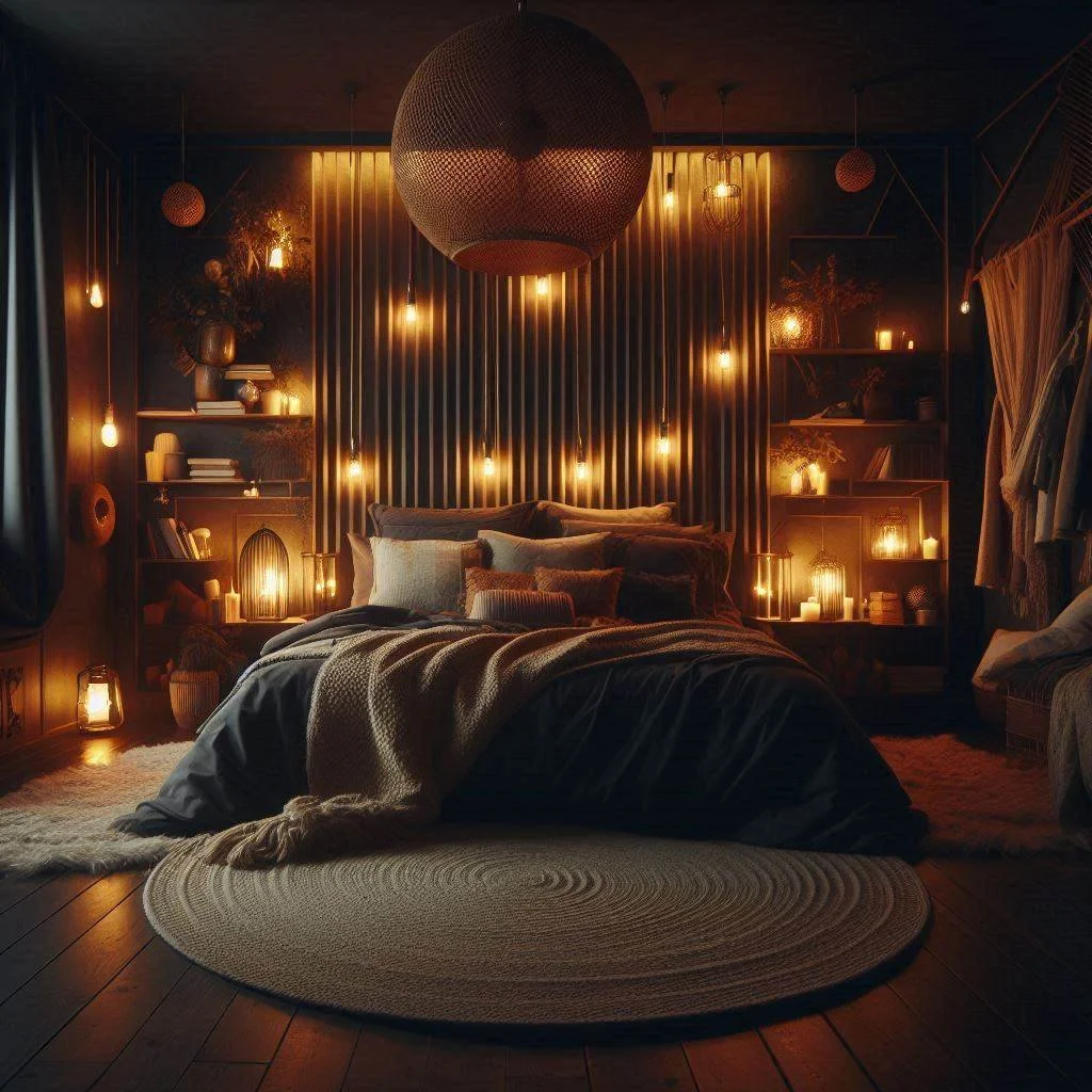 Lighting is a crucial element in establishing the mood in a dark cozy bedroom, serving both functional and aesthetic purposes. Start with ambient lighting, such as ceiling fixtures or chandeliers, to provide a base level of illumination that sets the tone of the space. Add task lighting, such as bedside lamps or adjustable reading lights, to cater to specific activities like reading or nighttime routines, ensuring they are both practical and gentle on the eyes. For a magical touch, incorporate accent lighting through wall sconces or strands of fairy lights. These create a soft, warm glow, accentuating the cozy atmosphere and enhancing the overall ambiance, making the bedroom not just a place to sleep, but a sanctuary for relaxation.