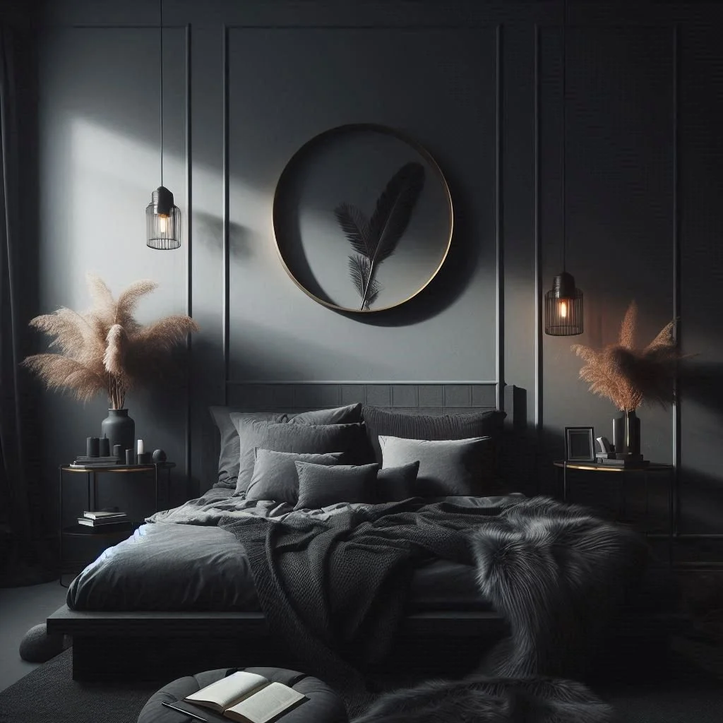 Lighting plays a crucial role in setting the mood in a bedroom with dark grey walls. To complement the cozy atmosphere, choose soft, warm lighting that creates a welcoming, intimate vibe. Layering your lighting is key: combine overhead fixtures with bedside lamps, and add string lights for a touch of magic. This layered approach creates pockets of light and shadow, enhancing the moody feel of a dark grey bedroom while ensuring it doesn’t become too dim. The result is a space that feels both inviting and effortlessly chic, striking the perfect balance between ambiance and brightness. By thoughtfully integrating various light sources, you can transform your dark grey retreat into a warm, stylish haven.