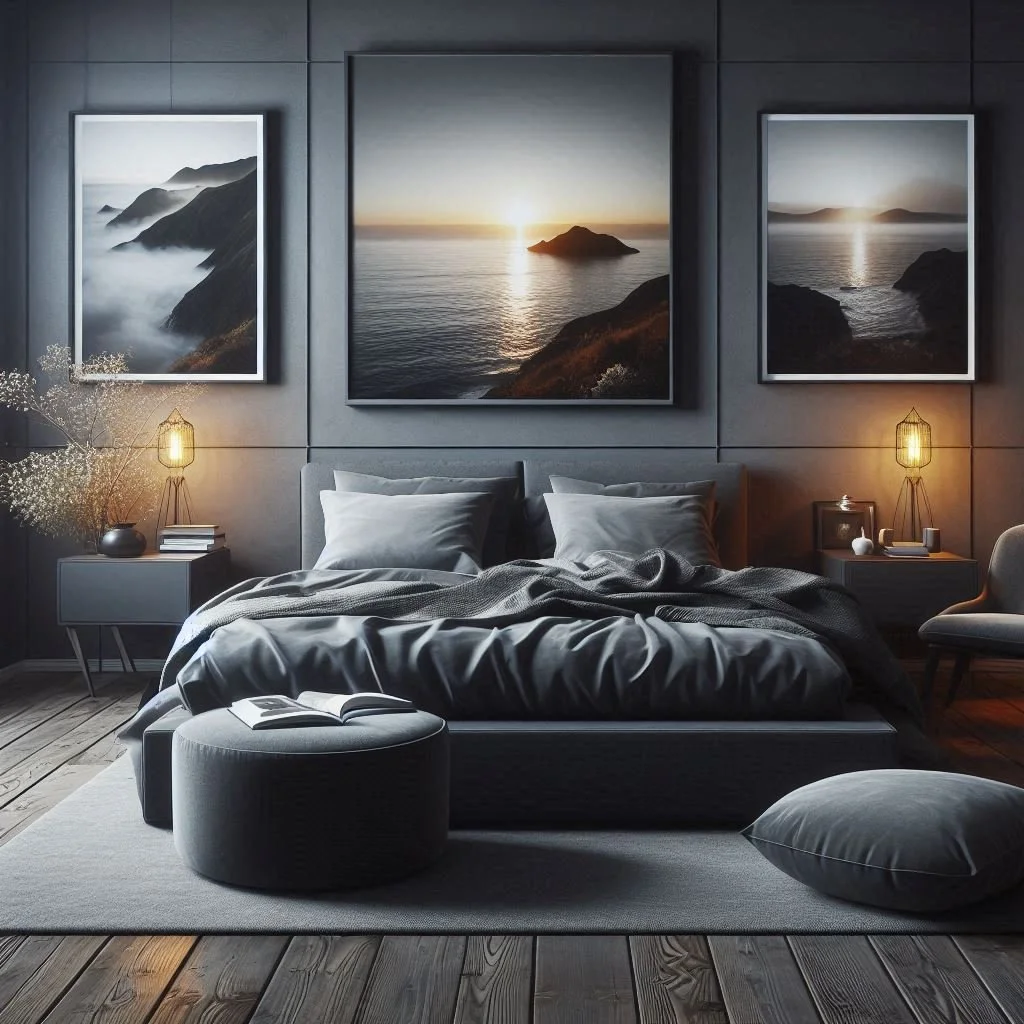 Artwork can transform a dark grey bedroom, elevating the entire space. Black and white photography offers a timeless, minimalist contrast that stands out against grey walls. For a more dynamic look, choose abstract art or colorful pieces that add vibrant pops of color against the moody background. This bold approach infuses personality and energy into the room, creating visual interest and character. Whether you prefer subtle or striking, the right artwork will enhance your space, making your bedroom uniquely yours and visually engaging. Art not only complements the dark grey tones but also reflects your style, turning your bedroom into a personalized, aesthetically pleasing retreat.