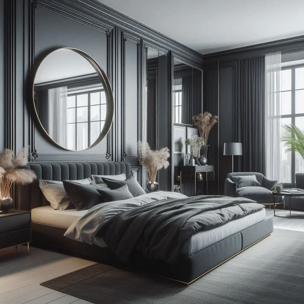 Mirrors are a designer’s secret weapon for making small spaces feel larger and brighter. In a dark grey bedroom, strategically placed mirrors enhance natural light and add depth to the room. For maximum impact, position a large round mirror above your bed or use a full-length mirror leaning against the wall to create an open, airy feel. Mirrors reflect light, preventing the room from feeling too dark while also introducing a touch of elegance and style. This simple addition brightens up the space and makes it feel more expansive, enhancing the overall ambiance of your dark grey retreat. By incorporating mirrors thoughtfully, you can transform a cozy room into a more vibrant, visually appealing environment.