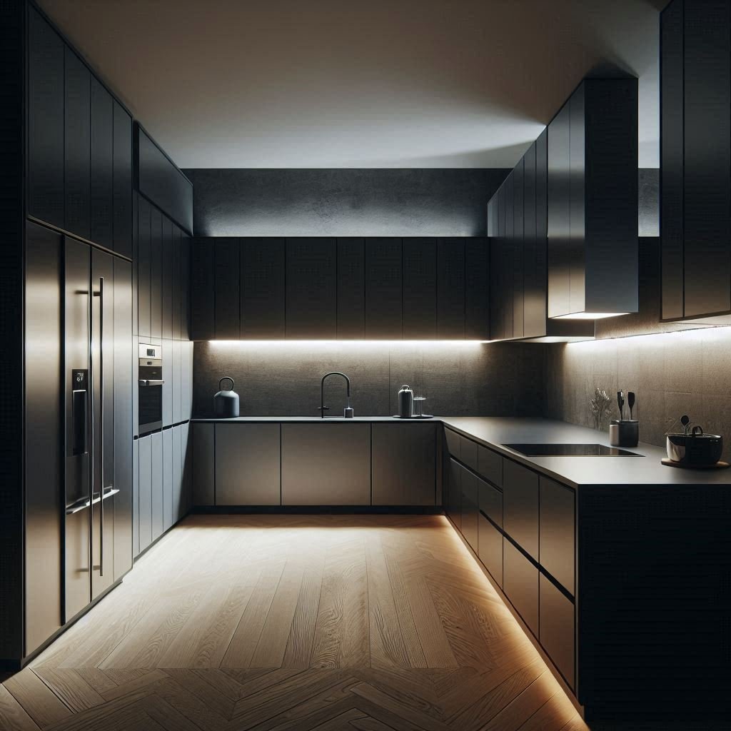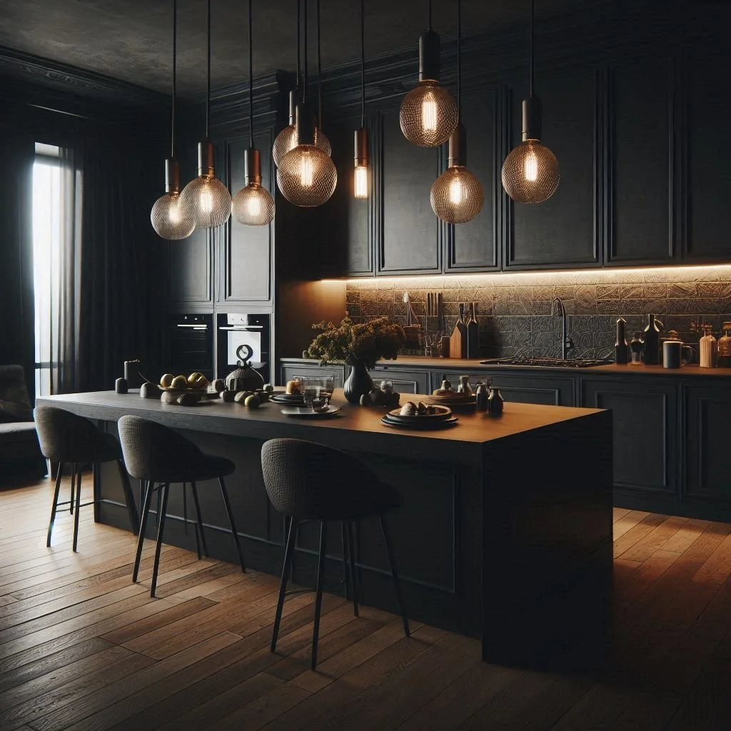 Under-cabinet lighting is indispensable in a dark kitchen, offering both functionality and ambiance. Utilize LED strips or puck lights to illuminate countertops and workspaces, ensuring clear visibility for cooking and food preparation tasks. This lighting solution not only enhances functionality but also accentuates the beauty of your countertops and cabinetry. By strategically placing under-cabinet lights, you create a well-lit and inviting environment that makes tasks easier and enhances the overall atmosphere of the kitchen. Whether you're chopping vegetables or enjoying a late-night snack, under-cabinet lighting adds a layer of convenience and elegance to your culinary space.
