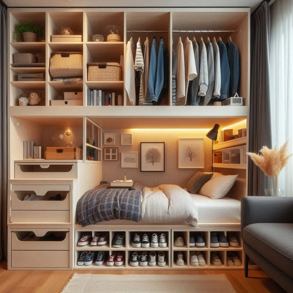 Utilize vertical space with shelves and wall-mounted storage. Opt for multi-functional furniture with built-in storage and use under-bed storage solutions.