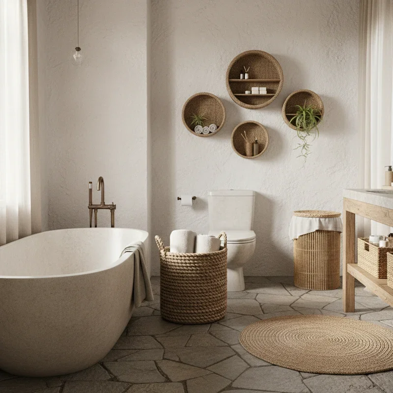 Storage becomes part of your decor when you choose woven baskets and natural containers that celebrate organic materials and traditional craftsmanship. Seagrass baskets in various sizes organize everything from towels to toiletries while adding textural warmth. Rattan magazine holders beside the toilet or woven hampers in corners provide functional storage that enhances rather than detracts from your design. These natural storage solutions soften the hard surfaces common in bathrooms while maintaining that essential earthy aesthetic. Mix different weaving patterns and natural materials like water hyacinth, bamboo, and jute for visual variety. Line baskets with natural linen for storing smaller items while maintaining the organic feel. Wall-mounted woven baskets create vertical storage without the clinical feel of traditional cabinets. These pieces age gracefully, developing character through daily use rather than looking worn. They prove that organization doesn't require hiding everything behind closed doors.
