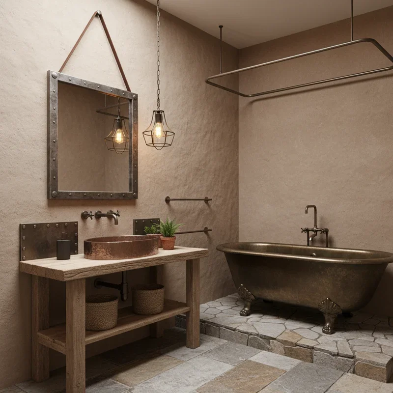 Raw metals like copper, brass, and iron add industrial edge to earthy bathrooms while maintaining that connection to natural materials. Exposed copper pipes become design features rather than eyesores, developing gorgeous patinas that shift from bright orange to deep green over time. Unlacquered brass fixtures age beautifully, telling the story of daily use through their evolving finish. Iron towel bars and toilet paper holders provide sturdy functionality with rustic appeal. These metals work particularly well against natural wood and stone, creating contrast that prevents your bathroom from feeling too soft or monotonous. Consider a hammered copper sink as a show-stopping focal point that improves with age. The key is choosing metals that will patina naturally rather than those with protective coatings that keep them artificially pristine. This embrace of natural aging processes reflects the earthy philosophy of finding beauty in imperfection and change.