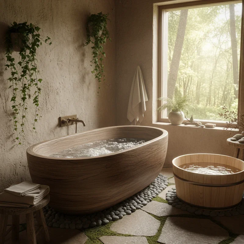 13. Wooden Bathtubs and Natural Soaking Vessels
