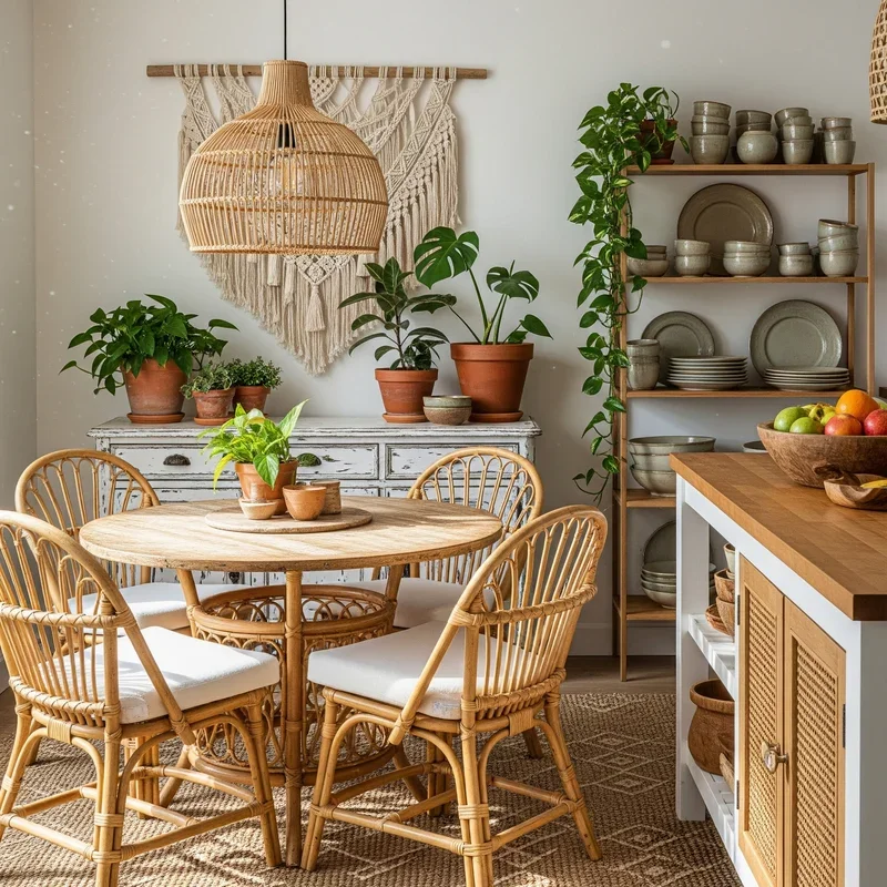Introduce rattan bar stools or a wicker bench that brings tropical ease and natural texture to your kitchen seating! These lightweight pieces add organic curves that soften the hard lines of appliances and cabinetry. The woven texture creates visual interest while maintaining the natural material palette essential to earthy boho style. Choose pieces with cushions in earthy linen or canvas for comfort without sacrificing the organic aesthetic. Rattan ages beautifully, developing character that makes each piece unique over time. Mix different weaving patterns between chairs for that eclectic, collected feel. The natural flexibility of these materials makes them surprisingly comfortable for long dinner parties. Your seating becomes an invitation to slow down and savor meals rather than rushing through them.