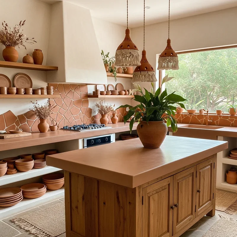 Bring the desert vibes indoors with terracotta pots, clay vessels, and earthenware that ground your kitchen in ancient traditions! These sun-baked beauties add warmth through their natural orange and brown hues while providing perfect homes for herbs and succulents. Use large terracotta planters as utensil holders or fill them with wooden spoons and spatulas for functional decoration. The porous nature of clay helps regulate moisture for plants while adding that perfectly imperfect handmade quality boho lovers adore. Mix different sizes and shapes of clay pots along windowsills or open shelves for an organic display. Consider a terracotta tile backsplash that brings Mediterranean warmth to your cooking space. These elements age beautifully, developing patinas that tell the story of countless meals prepared with love. Your terracotta collection becomes a celebration of earth's most basic building material transformed into functional art.