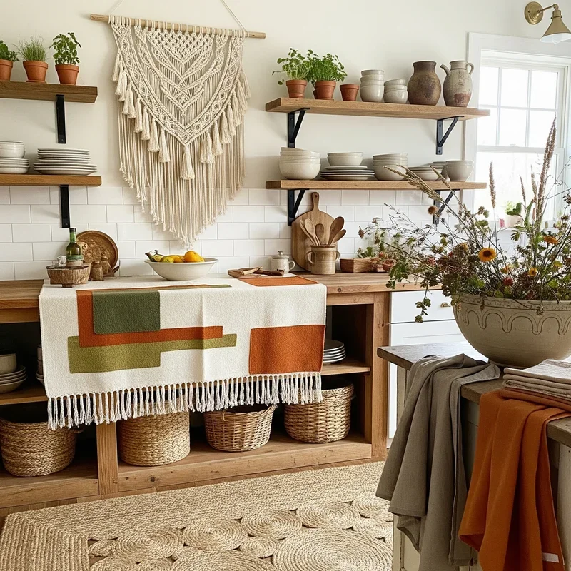 Layer your kitchen with bohemian textiles like kilim runners, mudcloth tea towels, and macramé curtains that soften hard surfaces! These fabric elements add color, pattern, and comfort that make kitchens feel less clinical and more lived-in. Choose natural fibers like cotton, linen, and jute that age beautifully and align with organic living principles. Mix patterns and textures fearlessly, letting different cultural influences blend in true boho fashion. Hang vintage suzani textiles as art or use them as tablecloths for special occasions. The softness of textiles balances the hard surfaces of appliances and countertops. Change them seasonally for instant refreshes without major renovations. Your textile collection becomes a soft embrace that makes your kitchen feel like home rather than just a cooking space.