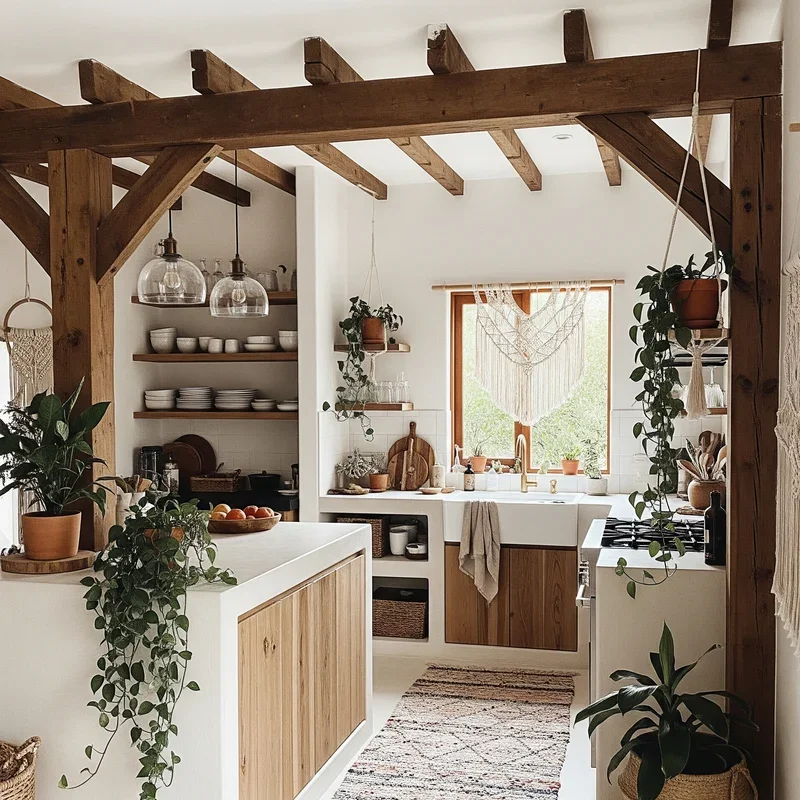 Celebrate architectural bones by exposing or adding wooden beams that bring rustic charm and vertical interest to your kitchen! These structural elements, whether original or decorative, create that cabin-in-the-woods feeling that grounds the entire space. Dark stained beams against white ceilings create dramatic contrast while natural wood tones blend seamlessly with other organic elements. Hang dried herbs, copper pots, or string lights from beams for functional decoration that maximizes vertical space. The horizontal lines draw the eye across the room, making spaces feel larger and more connected. Even faux beams can add incredible character to otherwise plain ceilings without structural changes. Consider running beams perpendicular to create a grid pattern that adds architectural interest. Your beams become the backbone of your boho kitchen, literally and figuratively supporting the organic aesthetic.
