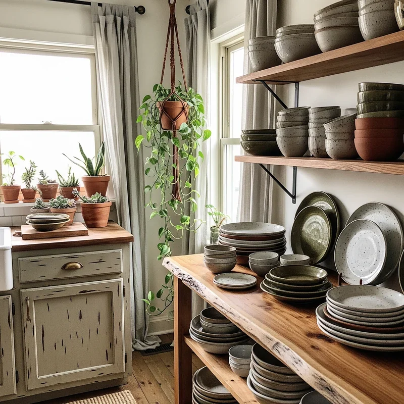 Stock your open shelves with handmade ceramics that celebrate imperfection and bring artisanal soul to every meal! These one-of-a-kind pieces with their unique glazes, slight irregularities, and organic shapes make even simple meals feel special. Mix different pottery styles and colors within your earth tone palette for visual interest that never gets boring. The weight and texture of handmade ceramics create a sensory experience that connects you to the act of eating. Support local artisans or try your hand at pottery for truly personal pieces. Display them prominently on open shelves where their beauty can be appreciated even when not in use. Each piece tells a story of human hands shaping earth into functional art. Your ceramic collection becomes a celebration of slow living and mindful consumption.
