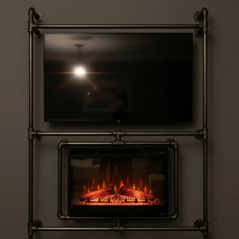 Industrial design lovers, rejoice! Black pipe frameworks create edgy, urban-inspired surrounds for your fireplace-TV combo. This DIY-friendly approach uses plumbing pipes and fittings to build custom frames and shelving. The raw, unfinished aesthetic pairs beautifully with exposed brick or concrete walls. Your electric fireplace sits within the lower framework section while pipes create mounting points for your TV above. Add wooden shelves between pipe supports for displaying books, plants, or decorative objects. The modular nature of pipe construction allows endless customization possibilities. This style works particularly well in lofts, converted warehouses, or modern industrial-themed homes. The contrast between sleek electronics and raw materials creates compelling visual tension. Budget-conscious homeowners appreciate the relatively low cost of pipe materials. Your finished project looks like something from a trendy downtown restaurant or boutique hotel.