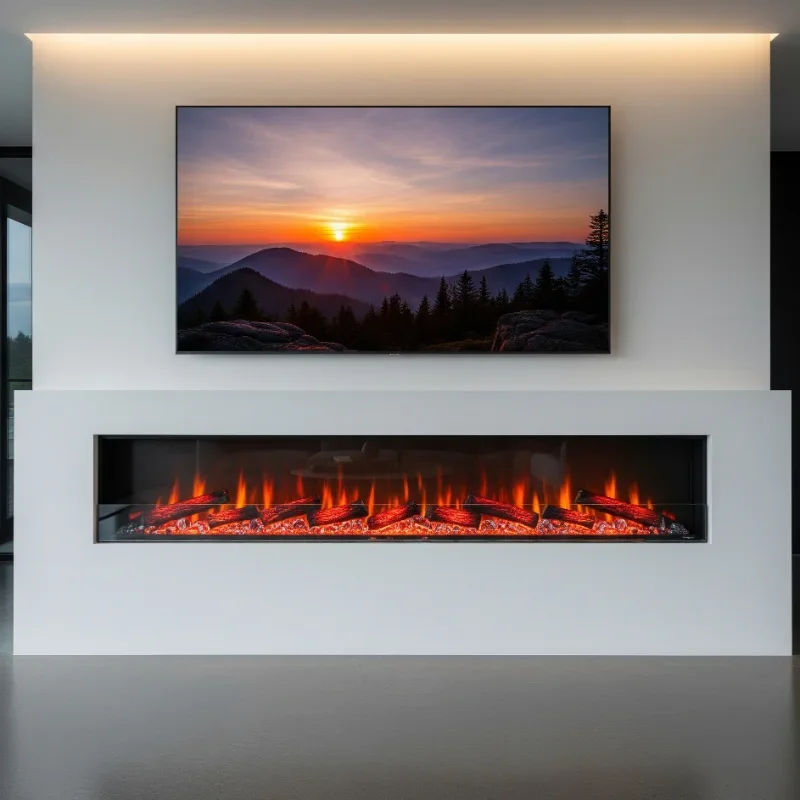 Picture this: a razor-thin electric fireplace stretching across your wall like a ribbon of flame, with your TV floating effortlessly above. Linear fireplaces have revolutionized modern living spaces with their clean lines and contemporary appeal. These wide, shallow units create dramatic horizontal emphasis that makes rooms feel larger and more sophisticated. The beauty lies in their versatility; whether you prefer realistic flame effects or abstract color displays, linear models deliver. Mount your TV directly above using a low-profile bracket to maintain that streamlined aesthetic. The key is keeping everything flush and aligned for maximum visual impact. Many linear models offer customizable flame colors to match your mood or decor. Heat output remains efficient despite the slim profile, warming spaces up to 400 square feet. This setup works brilliantly in condos, apartments, and modern homes where every inch counts.