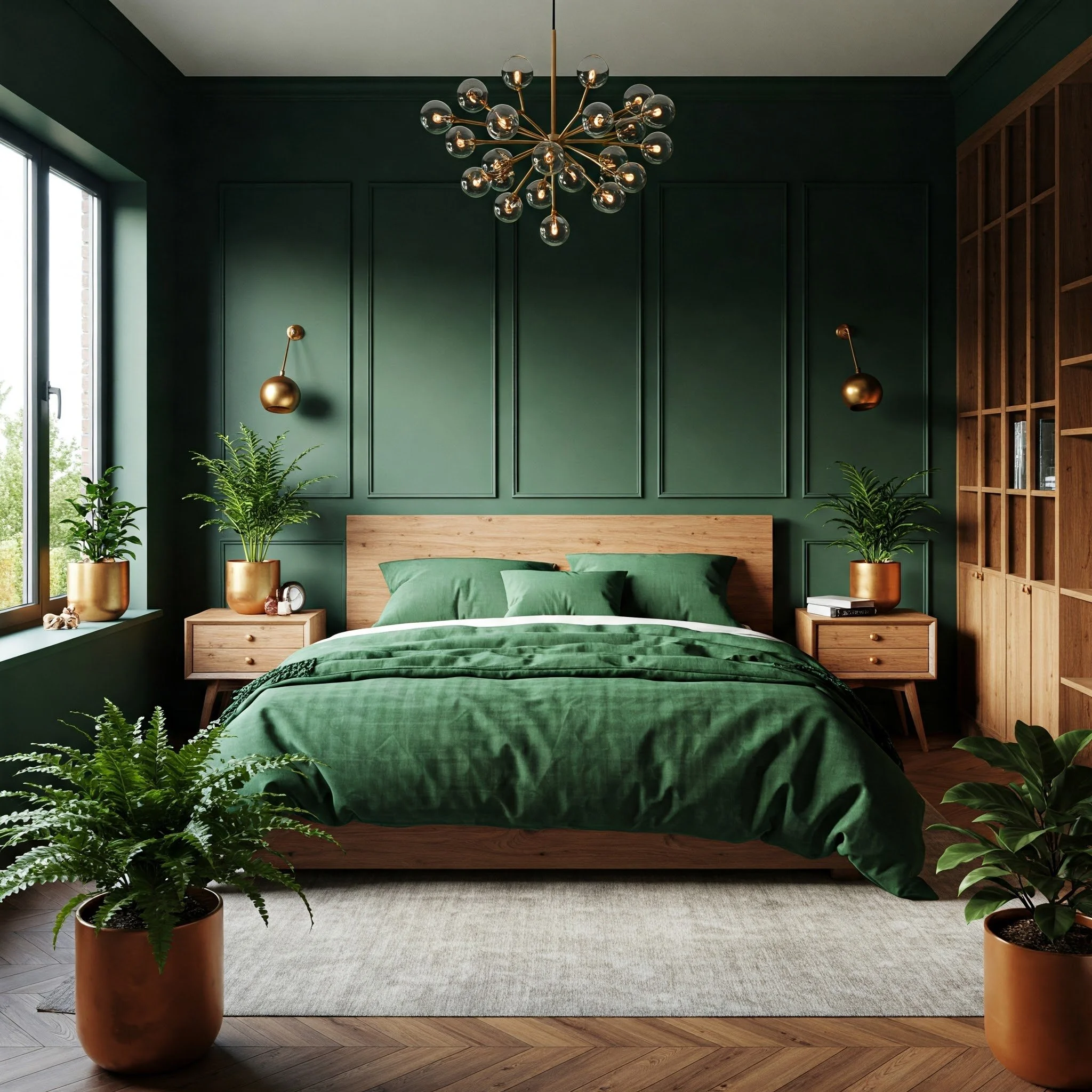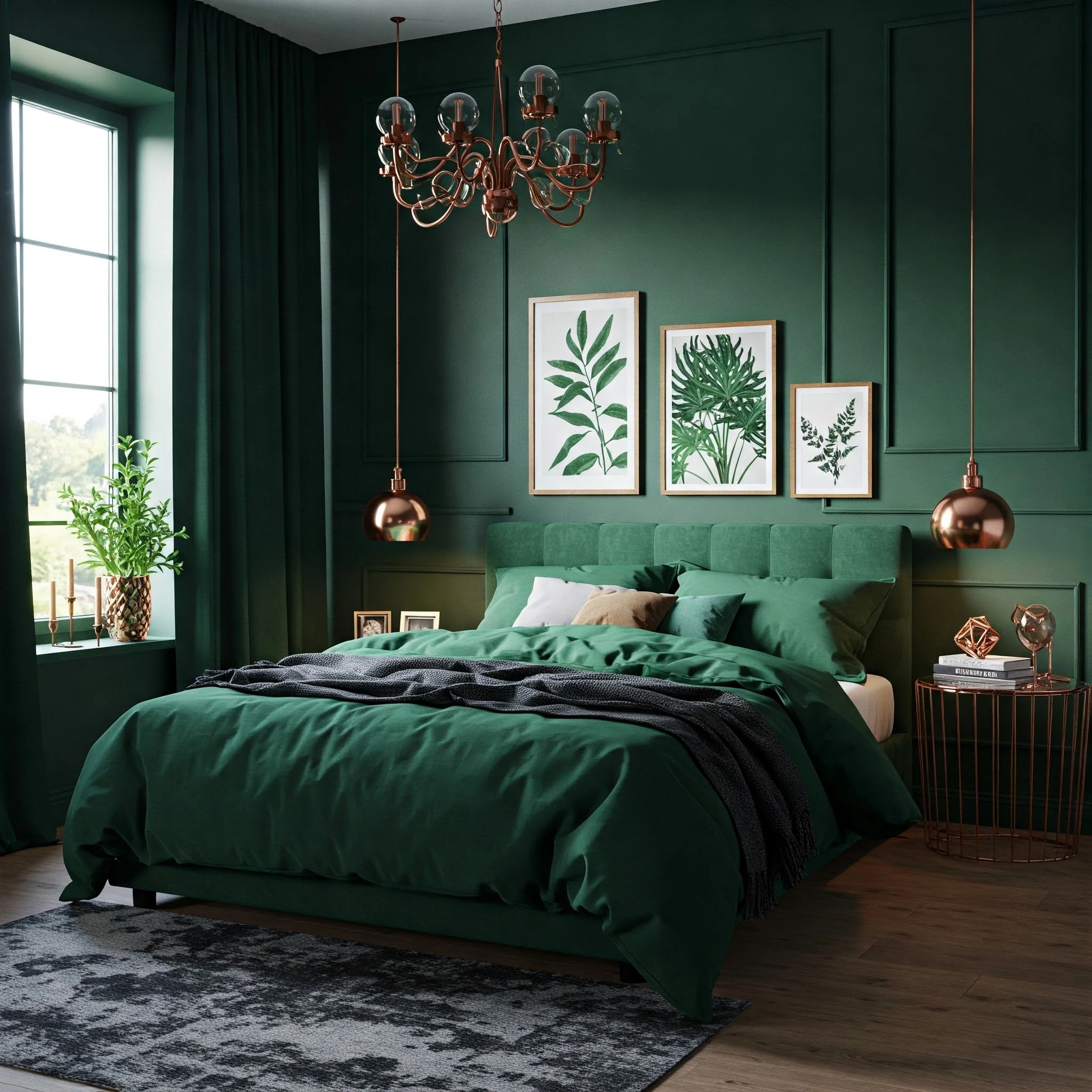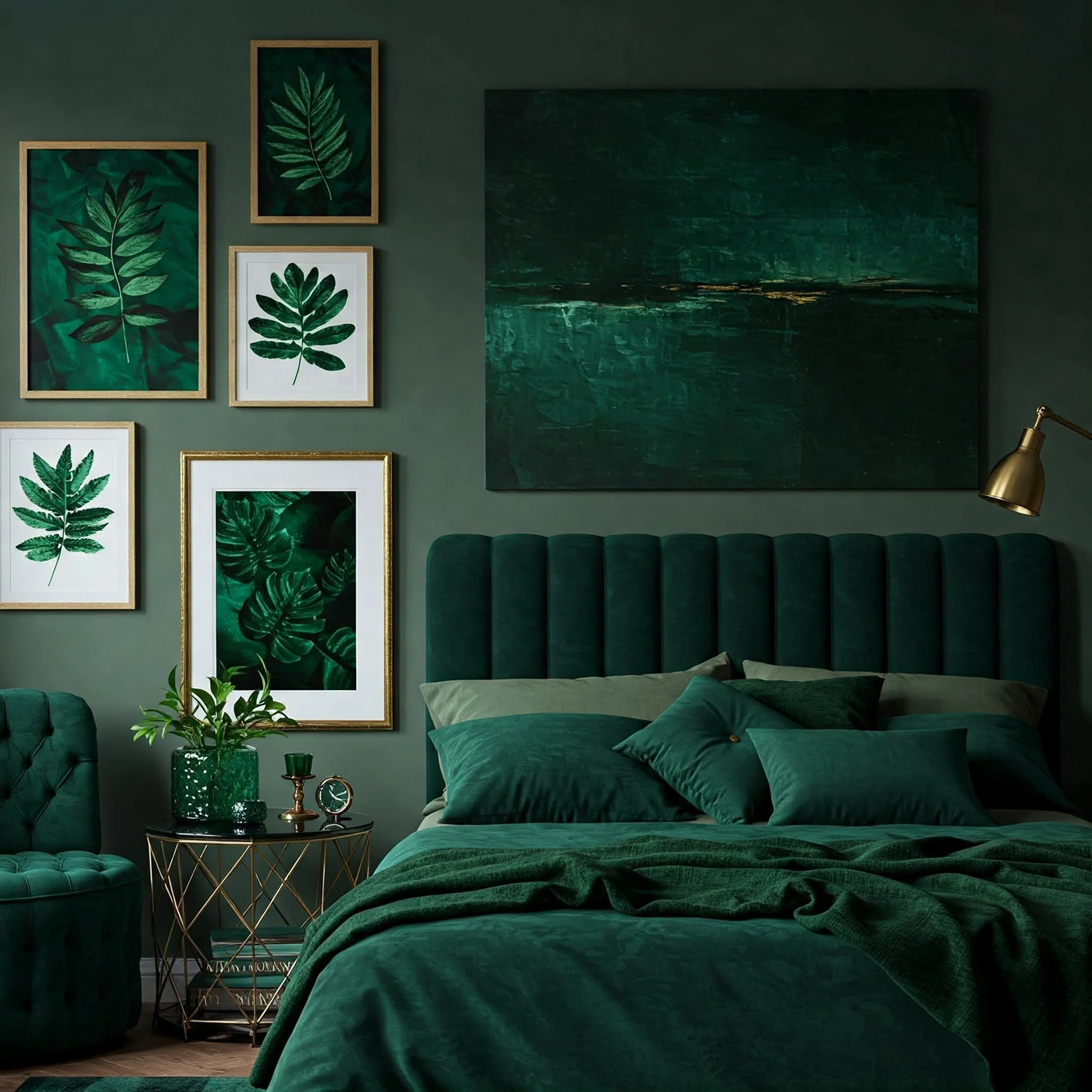 A statement wall in emerald or dark green can singlehandedly define the mood of your bedroom. It’s like rolling out the red carpet for your eyes each time you walk in. Rather than painting all four walls, focusing on just one—behind the bed, for instance—can make the color pop without overwhelming the space. If painting feels too permanent, wallpaper is another option. There are myriad designs featuring botanical prints or geometric patterns that play up the green theme. The trick is to let that bold wall take center stage. Keep the surrounding décor and textiles more subdued, allowing the dramatic color or pattern to shine. In essence, a well-executed emerald or dark green statement wall is the visual equivalent of a spotlight on stage: instantly drawing admiration, capturing attention, and telling guests you’re not afraid to make a stylish, confident statement.