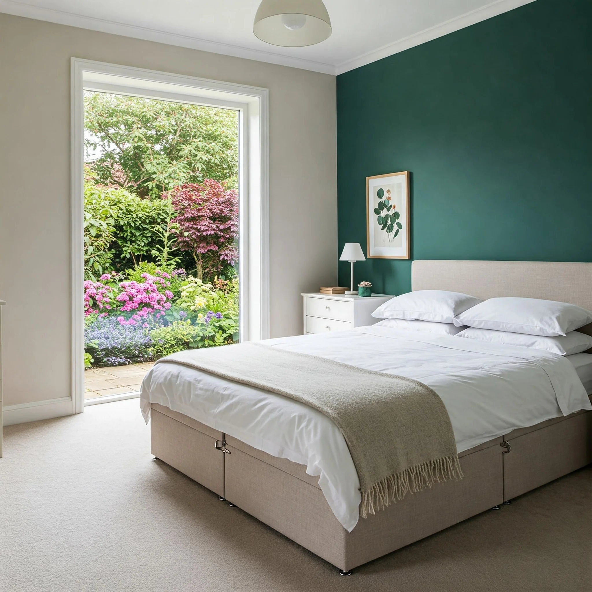 Go for clean lines and less clutter. A dark green bedframe or a single green wall can serve as the focal point, balanced by sleek furniture and simple, light-toned décor.