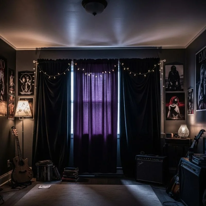 Control natural light with layered window treatments that allow you to adjust ambiance throughout the day. Start with blackout curtains in deep purple or black for those times when sunlight feels too aggressive. Layer with sheer black or gray curtains for filtered light that maintains privacy while allowing some illumination. Consider adding vintage lace panels for gothic romance or band tapestries for personalized touch. The ability to control light becomes crucial for maintaining the right mood during different activities. Add curtain ties made from old band tees or studded belts for authentic DIY touches. Position treatments to frame windows dramatically, making them design features rather than mere functional elements. This approach ensures your room maintains its atmosphere whether it's bright noon or moody midnight.