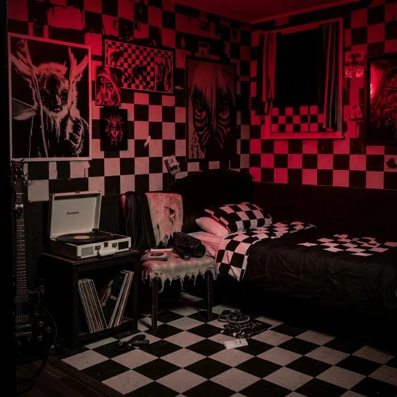 Incorporate the classic emo checkered pattern through various elements without turning your room into a chess board. Add a checkered throw rug beside your bed or use checkered pillowcases for subtle pattern play. Consider painting one accent wall with a large-scale checkered design in black and deep red or purple. The pattern adds visual interest and movement while staying true to emo aesthetic roots. Mix scales by combining small checkered accessories with larger pattern pieces for dynamic layering. This motif connects to both punk and emo traditions, bridging subcultural histories. Use the pattern sparingly to avoid overwhelming the space or making it feel like a racing flag. The geometric nature provides structure within otherwise flowing, emotional design elements.