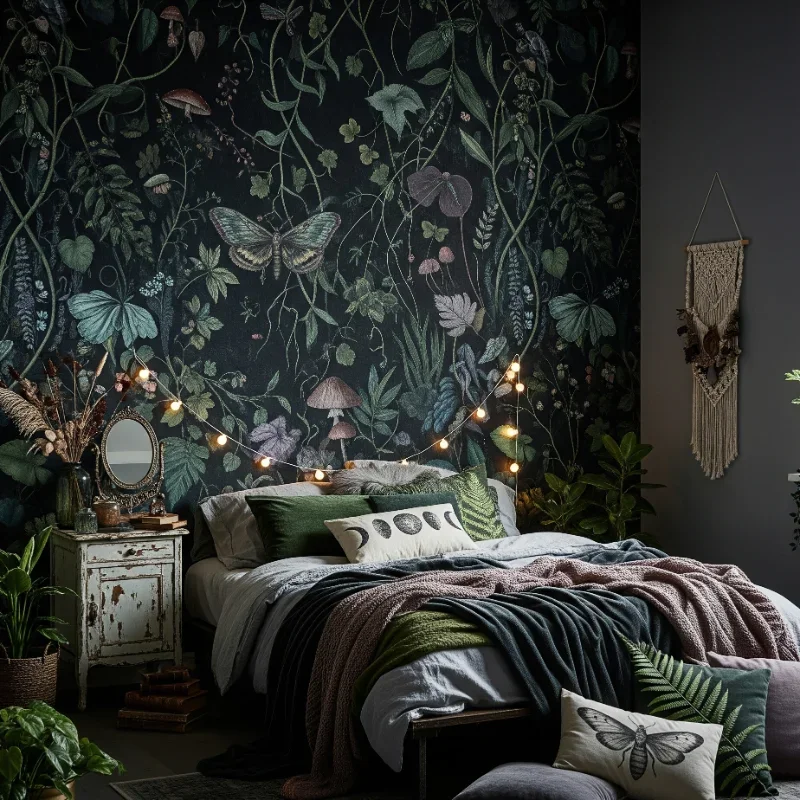 Transform your walls into an enchanted forest with a dark twist by incorporating moody botanical murals. Choose designs featuring black roses, thorny vines, or midnight blooms that capture both the beauty and danger of nature. Paint directly on walls or use removable wallpaper featuring gothic garden scenes with mysterious fog effects. Add depth by combining real dried flowers spray-painted black or deep purple with your mural. Consider incorporating glow-in-the-dark paint details for subtle magical elements that come alive at night. Mix botanical prints with grunge elements like vintage concert posters or band stickers placed strategically among the foliage. The key is creating a balance between delicate natural beauty and edgy darkness that defines fairy grunge perfectly. This foundation sets the entire mood for your space, making every other element feel intentionally curated rather than randomly placed.