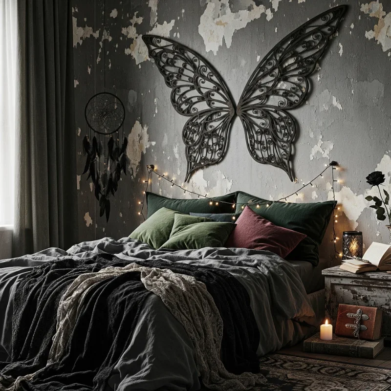 Create stunning focal points by incorporating fairy wings with a dark twist into your wall decor. Source vintage butterfly or fairy wings from thrift stores and spray paint them black, deep purple, or metallic gunmetal. Arrange multiple wings in artistic patterns, mixing sizes for visual impact. Create shadow boxes featuring preserved moths or butterflies alongside vintage jewelry and dried black roses. Commission or DIY large-scale wing murals using stencils and metallic paints that catch light mysteriously. Hang actual costume wings that have been distressed, adding chains, safety pins, or vintage brooches for grunge details. Consider mixing wing imagery with darker elements like thorns or spider webs painted directly on walls. This juxtaposition of delicate flight with gothic aesthetics captures fairy grunge's essence perfectly.