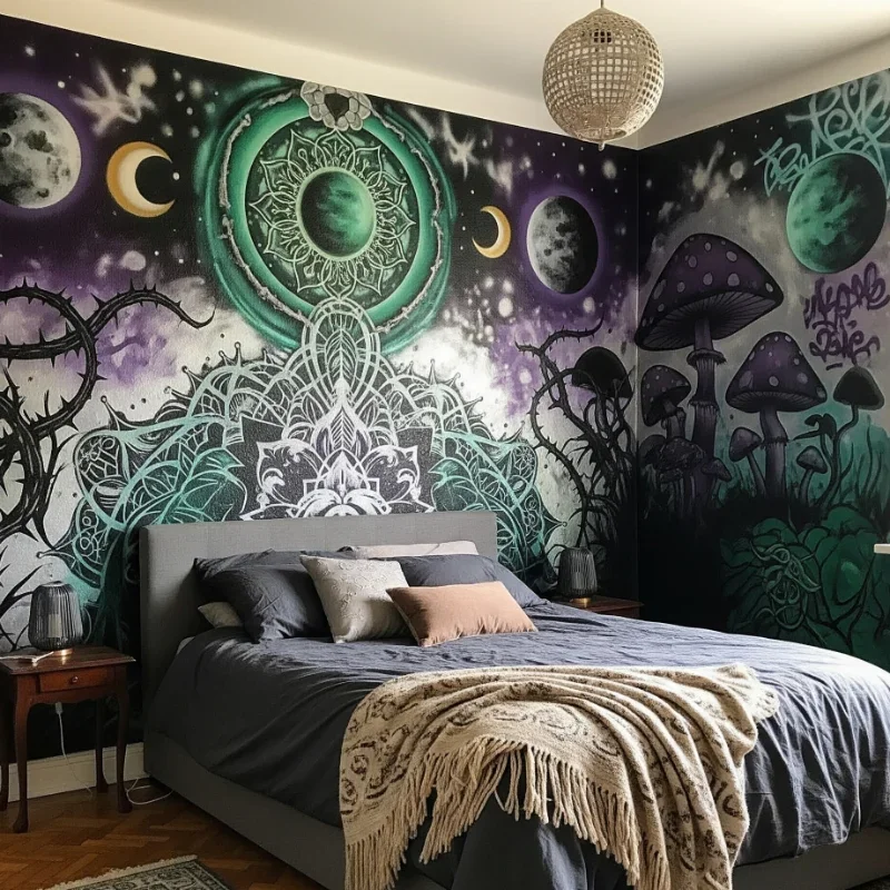 Personalize your walls with hand-painted elements that blend mystical symbols with grunge-style artwork. Create your own mystical graffiti using stencils of moon phases, crystal formations, or magical sigils painted in metallic or chalk paints. Add hand-drawn botanical illustrations with a dark twist directly on walls using permanent markers or paint pens. Include meaningful quotes from favorite songs or poetry in messy handwriting. Layer these painted elements with vintage band posters, tarot cards, or pressed flowers attached with vintage washi tape. Don't aim for perfection; embrace drips, smudges, and imperfect lines that add to the grunge aesthetic. This DIY approach makes your space uniquely yours while combining the mystical and rebellious elements that define fairy grunge style.