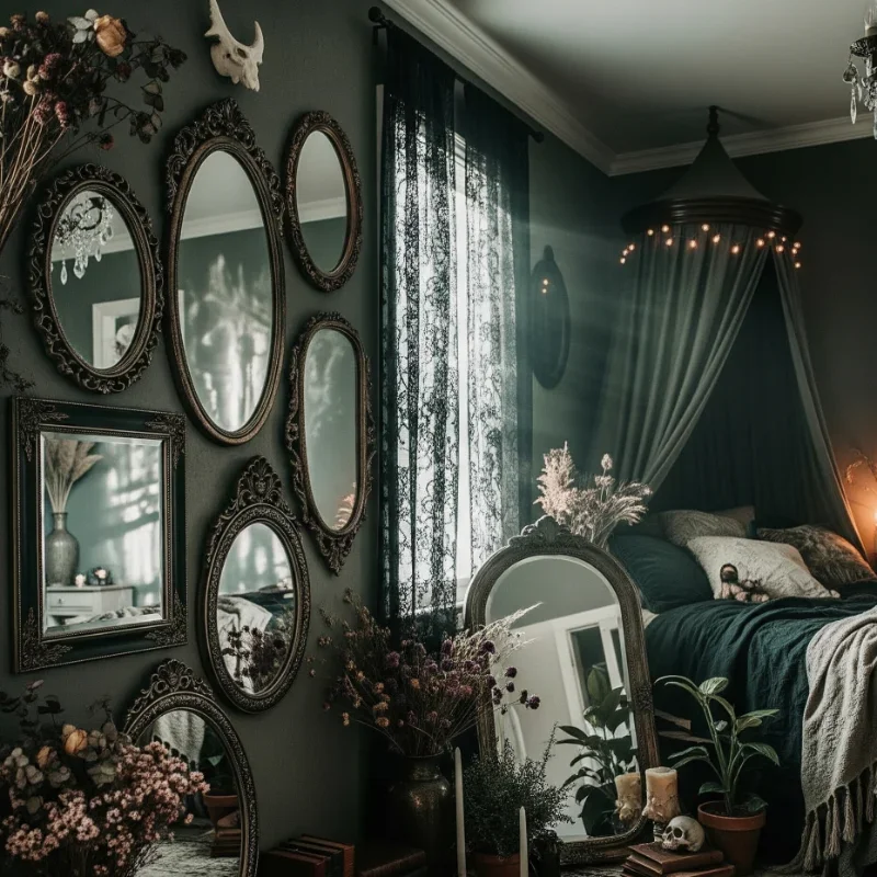 Build an enchanting gallery of mirrors that reflect both light and darkness throughout your fairy grunge bedroom. Hunt for ornate vintage mirrors and paint their frames matte black, deep purple, or distressed silver. Create asymmetrical arrangements mixing various shapes: sunbursts, ovals, and gothic arches. Add mystical elements by etching moon phases or occult symbols onto mirror surfaces using etching cream. Incorporate cracked or foxed antique mirrors for authentic vintage appeal that adds mysterious depth. Layer smaller mirrors within larger frames for dimensional interest. Position mirrors to reflect fairy lights or candles, multiplying magical ambiance. Some mirrors can be partially covered with black lace or have dried flowers tucked into frames. This reflective collection creates the illusion of portals to other realms while maintaining that essential fairy grunge edge.