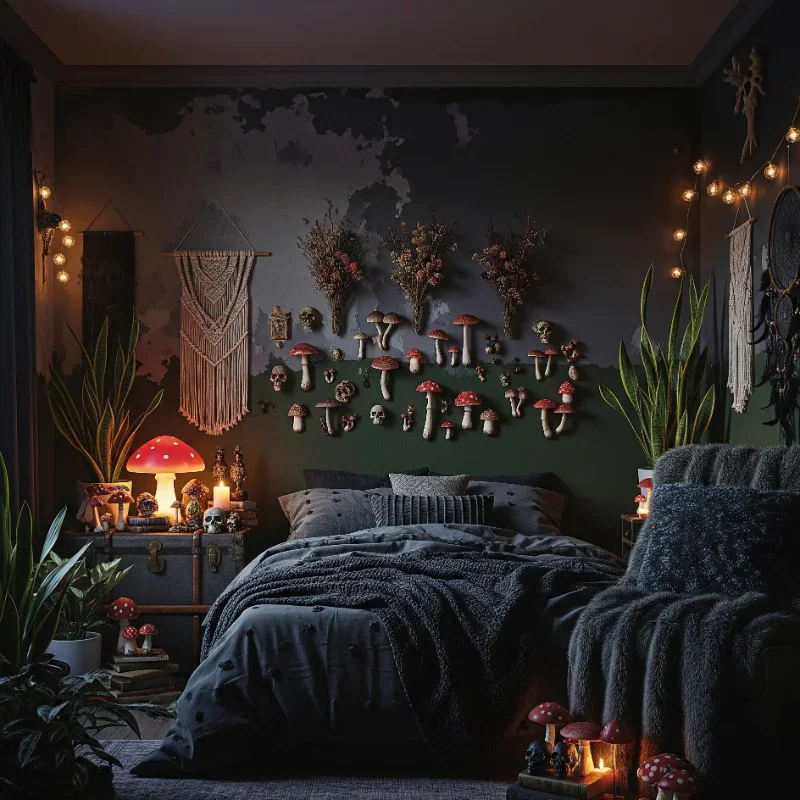 Embrace the life-and-death duality of fairy grunge by thoughtfully combining whimsical mushroom motifs with edgy skull elements. Display ceramic mushrooms in various sizes alongside vintage animal skulls or decorative skull candles. Create terrariums featuring moss, tiny mushroom figurines, and small resin skulls for miniature fairy grunge worlds. Paint mushroom designs on skull surfaces or add skull details to mushroom decorations for unique hybrid pieces. Use mushroom-shaped fairy lights near skull artwork or posters. This unexpected pairing represents fairy grunge perfectly: growth and decay, whimsy and edge, life and death existing harmoniously. Arrange these elements on floating shelves, creating vignettes that tell stories of enchanted forests where danger lurks. The contrast keeps your space from leaning too heavily toward either aesthetic, maintaining that perfect fairy grunge balance.