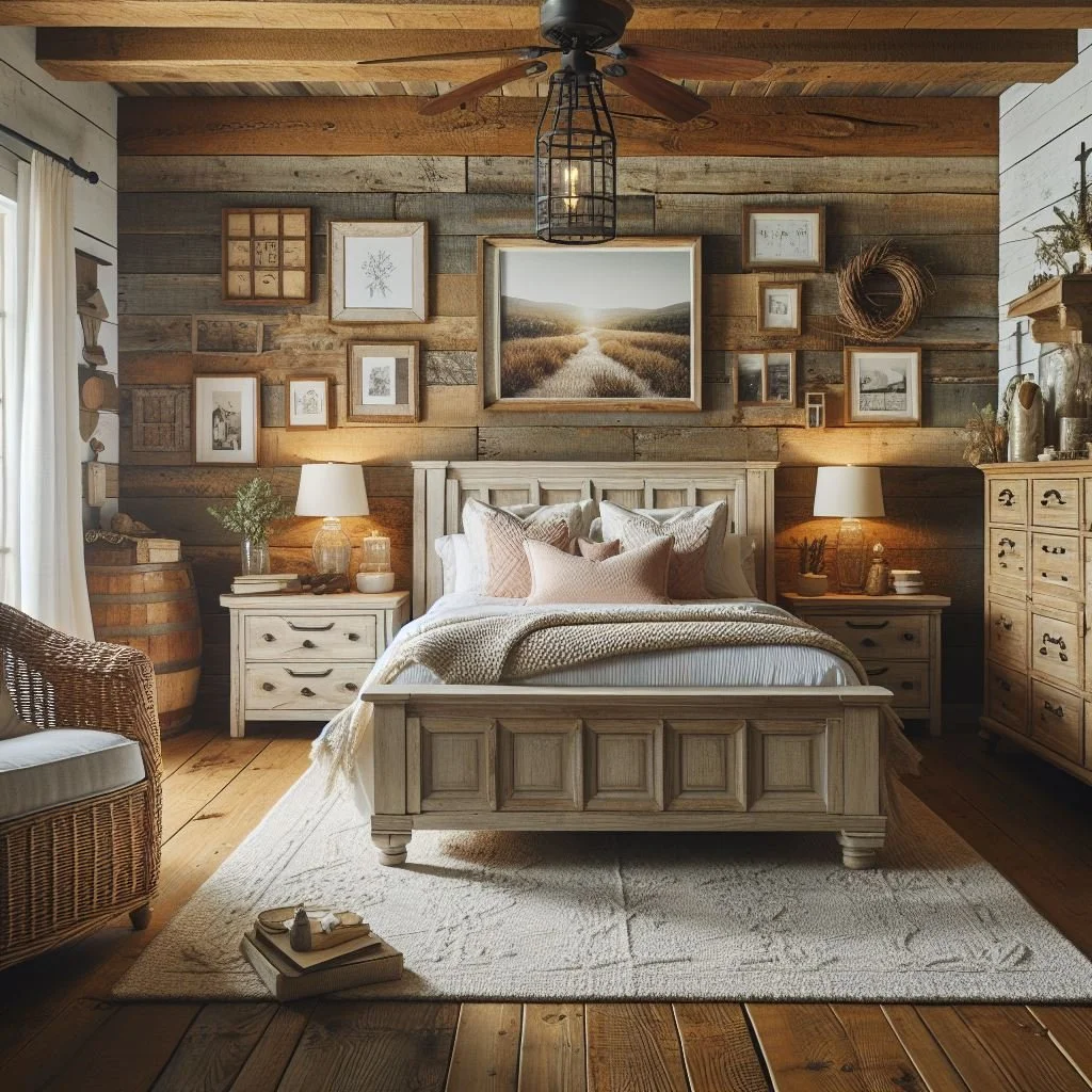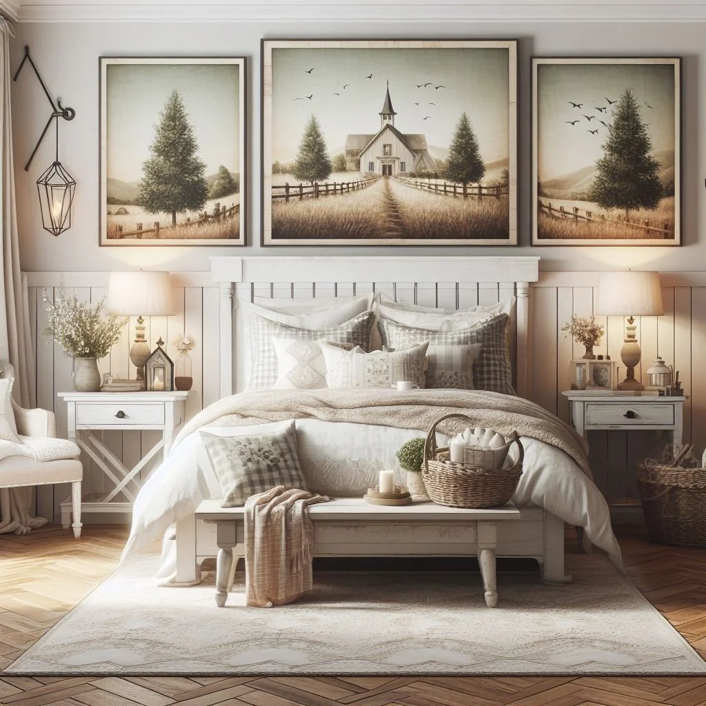 Adorn your farmhouse bedroom walls with country chic wall art such as framed botanical prints, vintage maps, or rustic signs. These delightful accents inject personality and warmth into your space, evoking a sense of nostalgia and comfort. Botanical prints bring a touch of nature indoors, while vintage maps add a sense of adventure and history. Rustic signs infuse your bedroom with farmhouse flair, adding whimsy and character to the overall aesthetic. Whether arranged in a gallery wall or displayed individually, these charming artworks create focal points that draw the eye and spark conversation. Combined with other farmhouse-inspired decor elements like reclaimed wood furniture and soft textiles, they contribute to a cozy and inviting atmosphere that beckons you to unwind and enjoy the simple pleasures of country living.