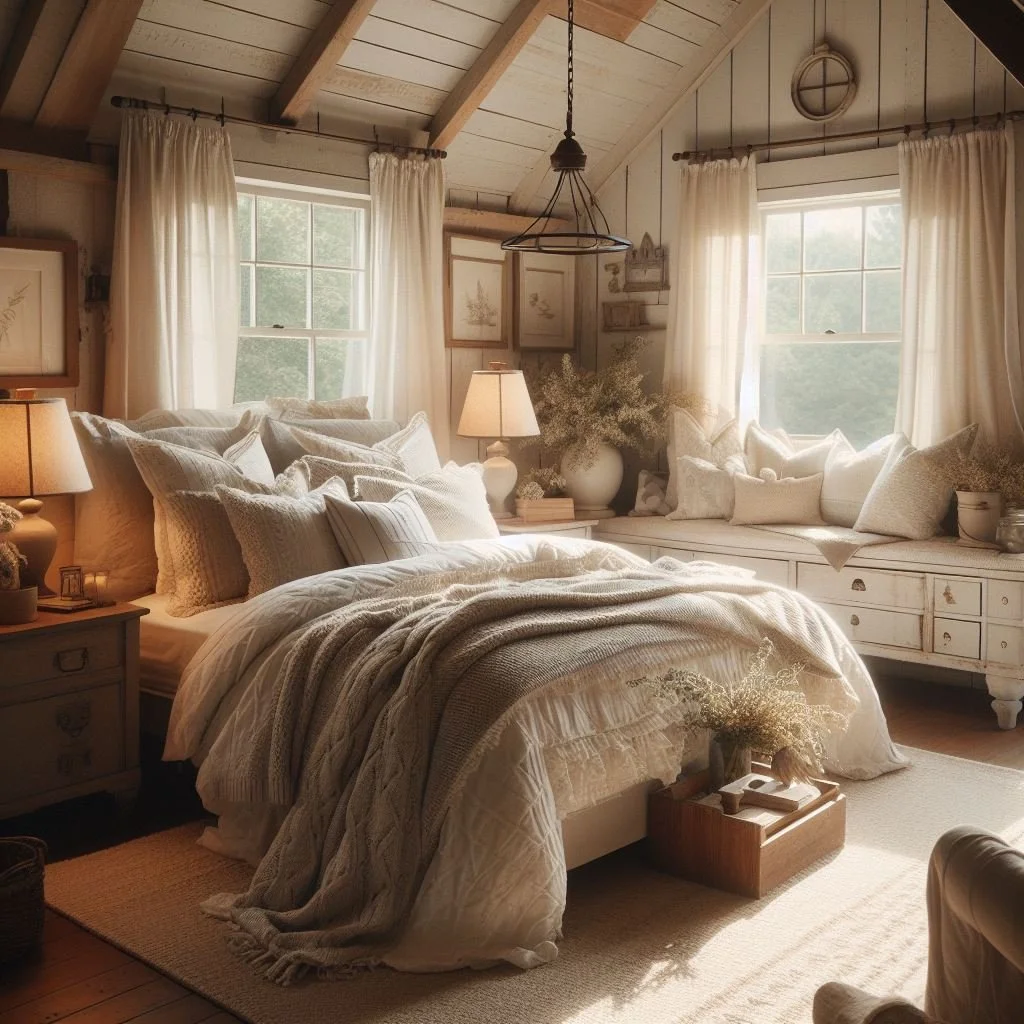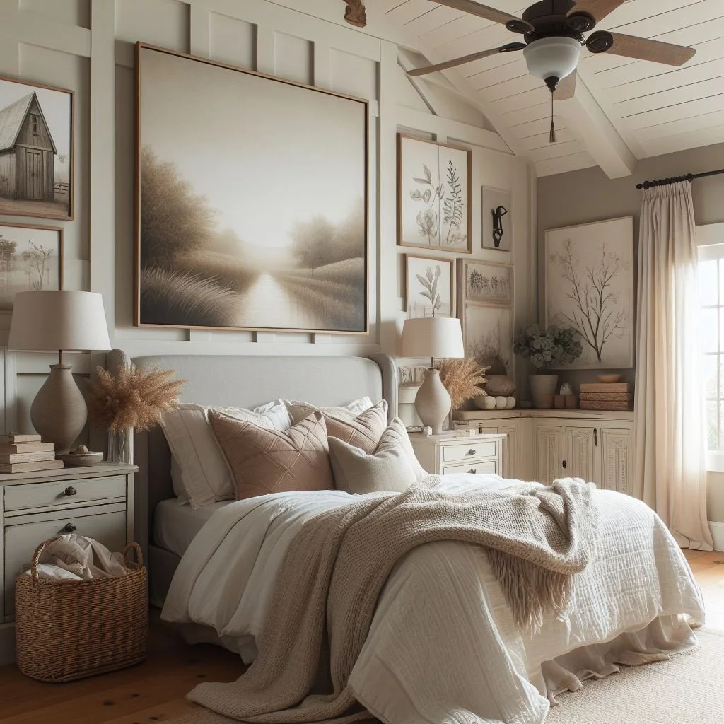 Keep your farmhouse bedroom palette soft and neutral with shades of white, cream, beige, and gray. These subtle and understated hues set a serene tone, inviting you to relax and unwind after a busy day. White and cream evoke a sense of purity and tranquility, while beige adds warmth and softness to the space. Incorporating touches of gray lends a modern and sophisticated feel, balancing out the overall palette. Together, these soft and neutral tones create a harmonious backdrop that enhances the cozy and inviting ambiance of your farmhouse bedroom, making it the perfect retreat for rest and relaxation.