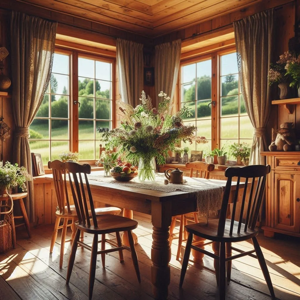Bring the outdoors in by incorporating natural elements like fresh flowers, potted plants, and wooden accents. These touches add life and vibrancy to your dining room, creating a warm and inviting atmosphere. Fresh flowers can be a beautiful centerpiece, while potted plants can adorn shelves or windowsills, adding greenery and freshness to the space. Wooden accents, such as a reclaimed wood table or rustic wooden shelves, bring warmth and texture, enhancing the farmhouse feel. By integrating these natural elements, you create a dining room that feels cozy, welcoming, and connected to nature, making every meal feel like a special occasion.