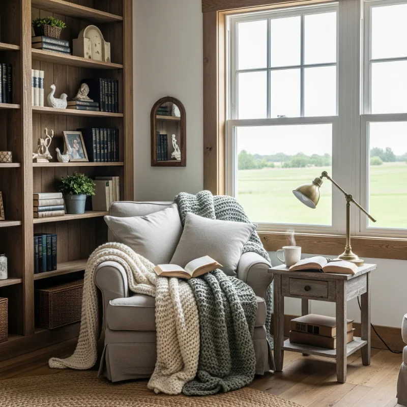 Everyone needs a quiet corner to escape with a good book and cup of tea. Creating a farmhouse reading nook transforms unused spaces into cherished retreats. Tuck a comfortable chair near a window, add soft throws and plenty of pillows. Include a small side table for your essentials and good lighting for those evening reads. Built-in benches with storage underneath maximize space while adding charm. Surround yourself with floating shelves filled with beloved books and small treasures. The nook becomes your personal sanctuary where time slows down. Add a soft rug underfoot and maybe a small plant for life. This space doesn't need to be large; even a corner can become magical. Your reading nook proves that luxury isn't about size but about creating moments of peace.