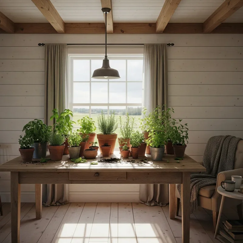 Nothing connects farmhouse living to its agricultural roots like growing your own herbs indoors. Kitchen windowsills lined with potted basil, rosemary, and thyme bring life and fragrance to your cooking space. These mini gardens provide fresh ingredients while adding natural beauty. Use vintage containers like enamelware, mason jars, or weathered terra cotta for authentic charm. Wall-mounted systems save counter space while creating living art. The satisfaction of snipping fresh herbs for dinner connects you to the land, even in urban settings. Beyond culinary uses, herbs like lavender and mint provide natural aromatherapy. Caring for plants adds mindful moments to busy days. Your kitchen becomes more than a cooking space; it's a growing space. Fresh herbs elevate both your meals and your mood. Who needs store-bought when homegrown tastes this good?