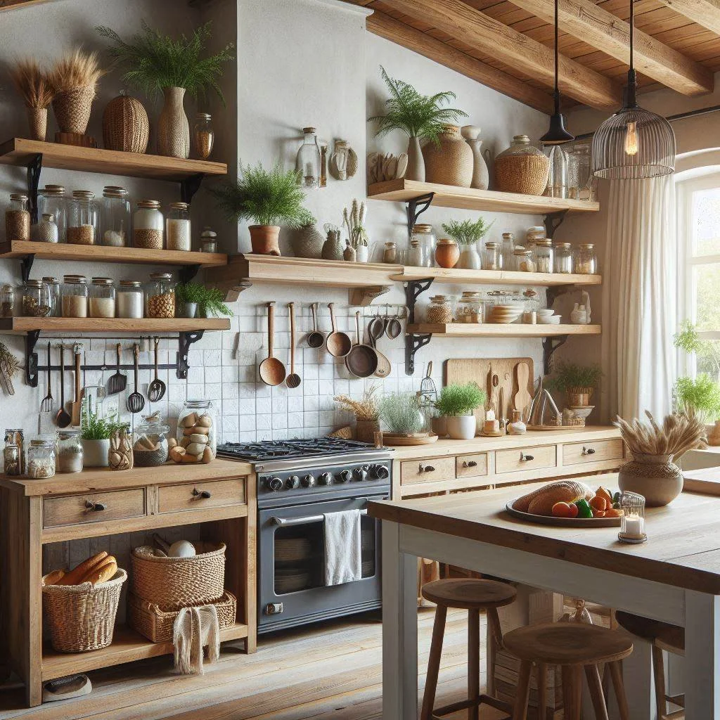 Open shelves bring both functionality and beauty to farmhouse kitchens. They allow you to showcase your favorite crockery, mason jars filled with pantry staples, or vintage glassware, adding character and charm to your space. To maintain a cohesive and tidy look, consider sticking to a specific color scheme or organizing items by size and shape. For example, group similar-toned jars or stack plates neatly to create a harmonious display. Open shelving also helps keep everyday items easily accessible while adding a touch of rustic warmth to the kitchen. Pair open shelves with natural wood finishes or whitewashed surfaces to complement the farmhouse aesthetic, and don't forget to add a few personal touches like small plants or decorative baskets for extra style.